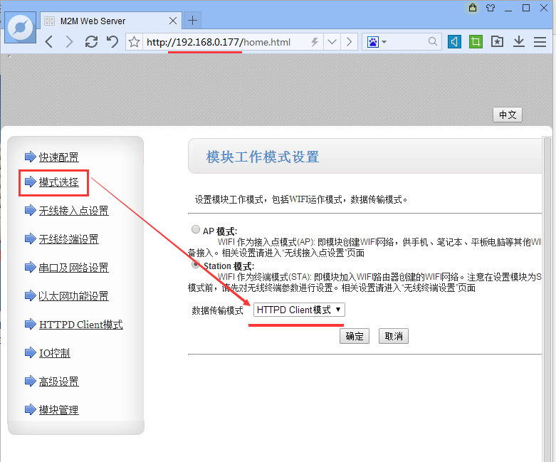7:然后进入WiFi模块的配置网页,把模块配置为HTTPD_client协议。