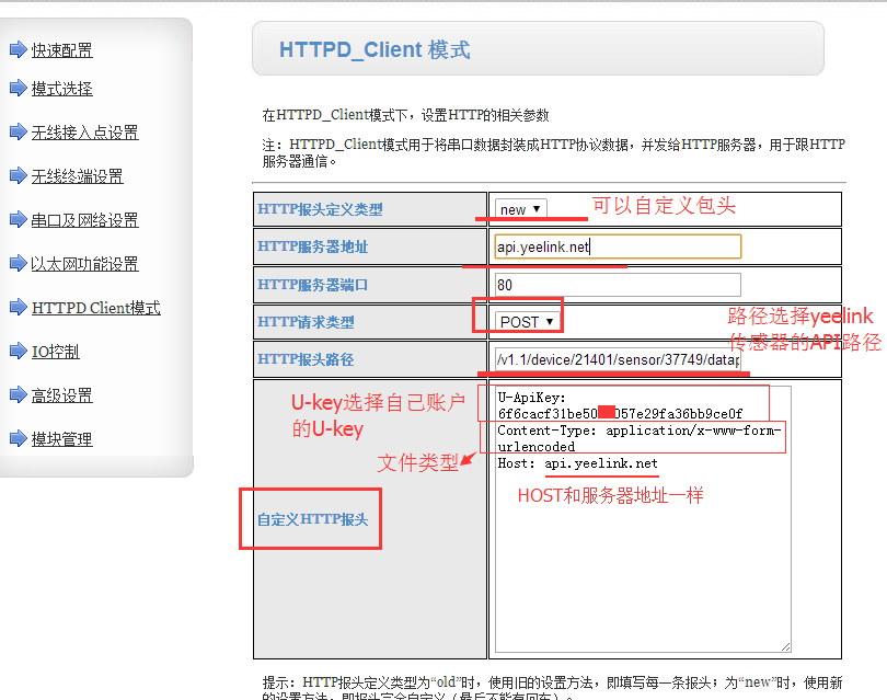 8:设置HTTP提交的格式。设置:自定义包头,设置U-ApiKey为自己账号的KEY, 设置Content-Type ,Host为api.yeelink.net.
