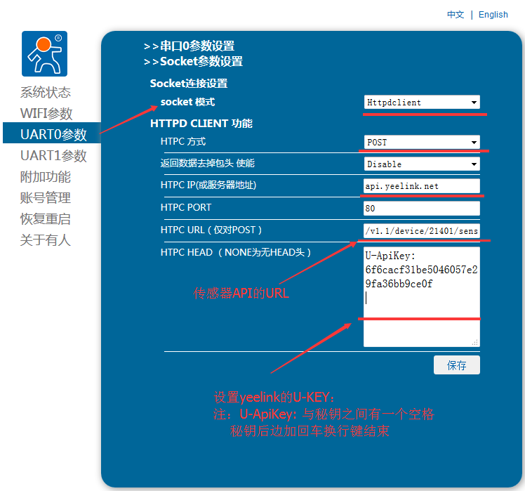 7:然后进入WiFi模块的配置网页,把模块配置为HTTPD_client协议。设置:自定义包头(HEAD)包头设置U-ApiKey为自己账号的KEY。 HTPC URL 设置为以上 传感器API地址。
