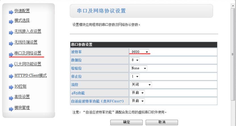 g)读卡器波特率为9600,所以需要将604模块波特率修改为和读卡器匹配。连接上模块的无线信号后,打开浏览器输入10.10.100.254,账户密码为admin,进入到模块内置网页后,在串口及网络设置里将模块波特率修改为9600,参数设置完毕后点确定并重启模块。电脑重新连接到模块信号。