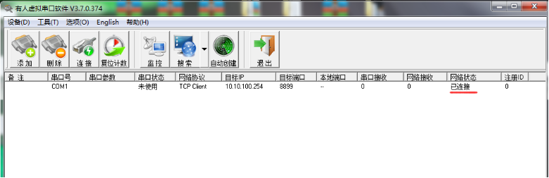 i)已添加COM口连接到模块后,虚拟串口软件上的网络状态会显示已连接。如网络状态显示连接失败,请将604模块恢复默认设置并重复上述步骤。