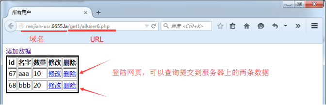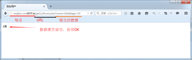 1.浏览器模拟GET方法提交数据到服务器。通过浏览器以GET的方法向服务器enjian-usr.6655.la提交数据,分别变量name和age传入参数,提交成功返回OK。 renjian-usr.6655.la/get1/alluser.php?name=aaa&age=10