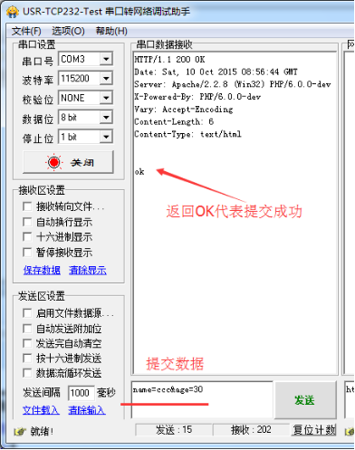 4.串口提交数据:将串口服务器串口连接到电脑串口上,然后发送提交的数据。串口发送name=ccc&age=30 name和age等号后边的内容则为提交的数据
