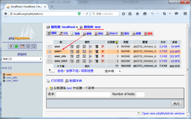 (2)mysql数据库搭建:在数据库test内新建一个数据表user1