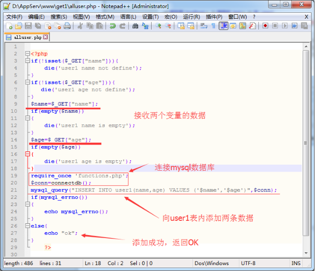 a.将提交的get数据传到mysql数据库的user1表内。