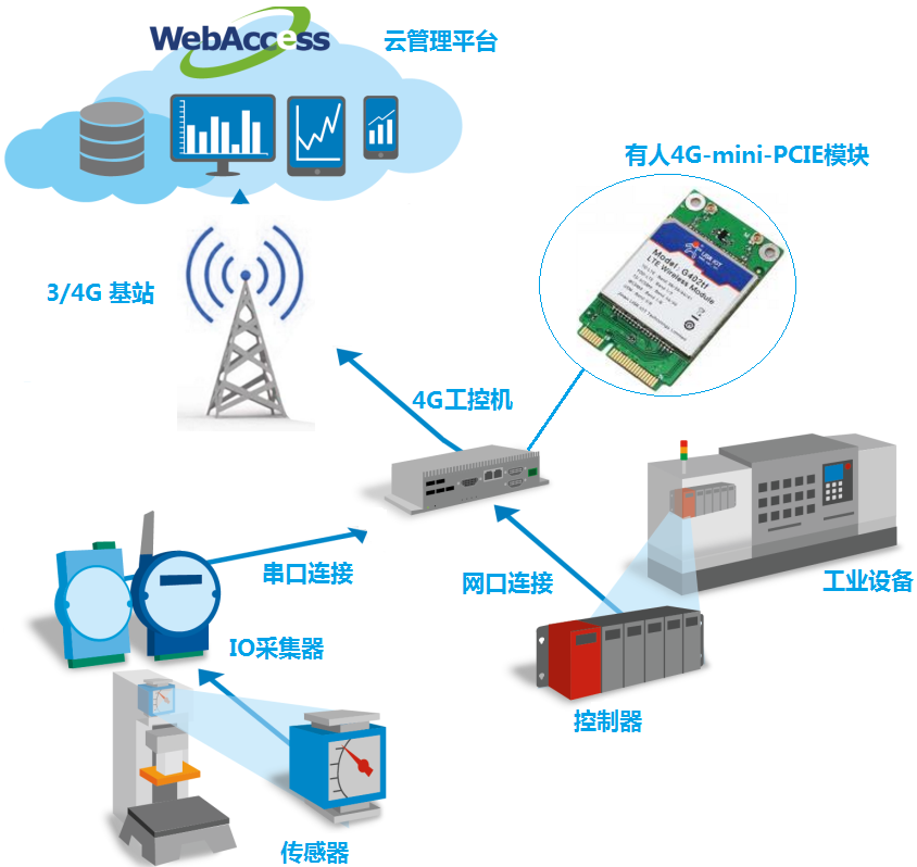 1:实现功能:研华工控机,内部自带mini-PCIE接口,内部可以插接mini-PCIE接口的WiFi和4G模块,实现工控机的联网。连接上4G模块后,工控机不用连接宽带网络即可实现工控机上网,可以把现场的数据发送到远端工控云管理平台上。