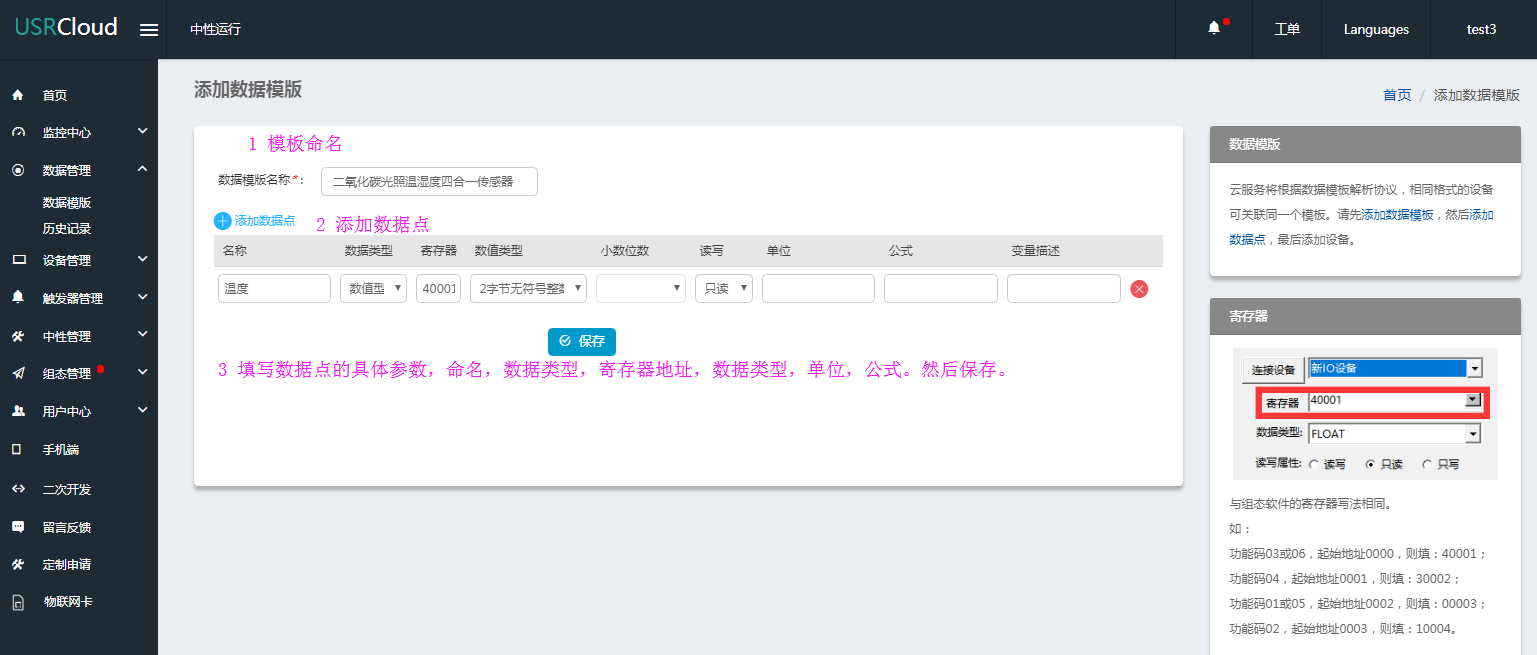 2.2 数据点说明:数据点就是根据modbus从机设备不同的寄存器来显示不同的数据,实现解析的目的。