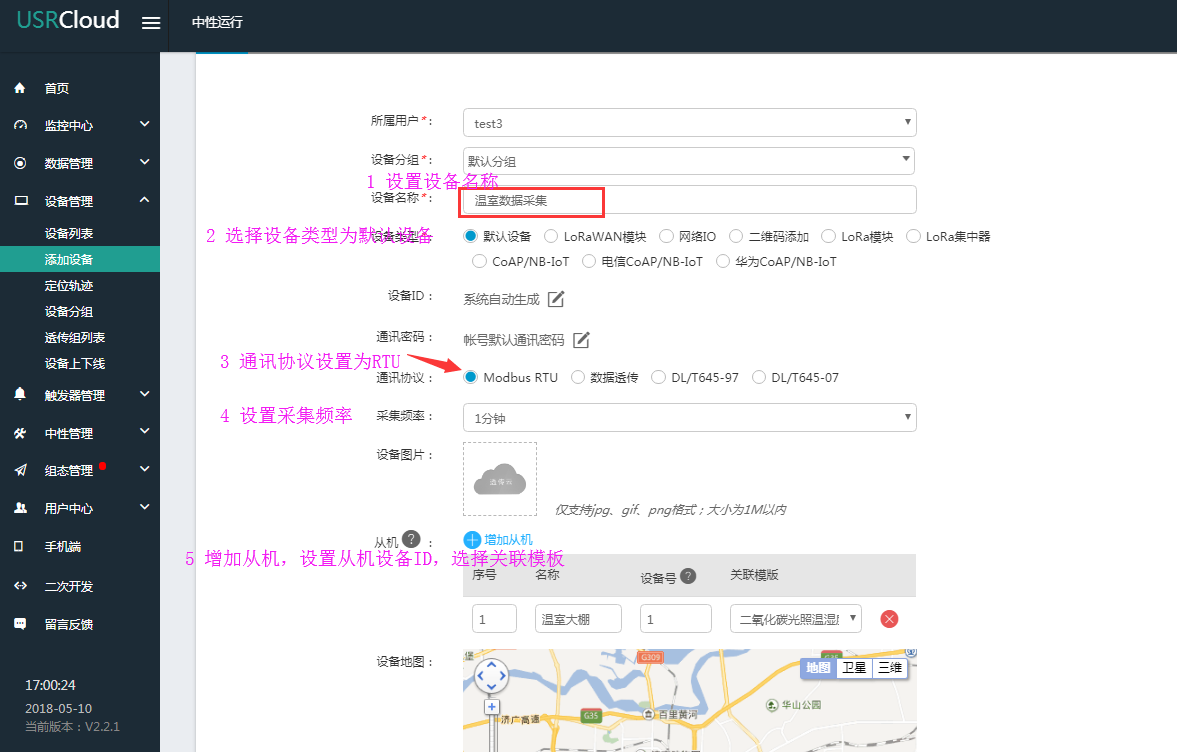 设备管理→添加设备→设备名称→通讯协议→采集频率→增加从机→保存