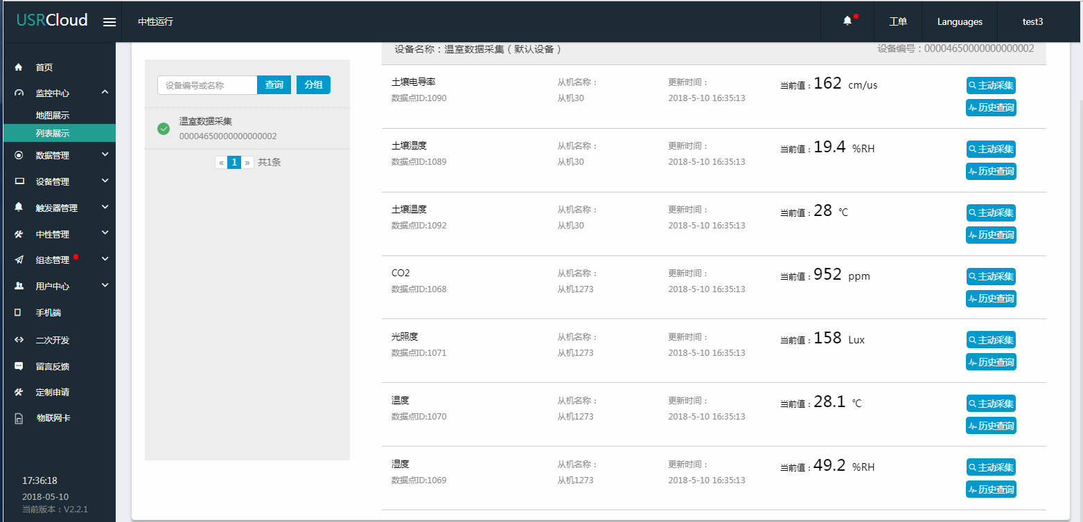 监控中心内列表展示可以看到设备的数据,也可以在关联的微信小程序内查看具体信息。
