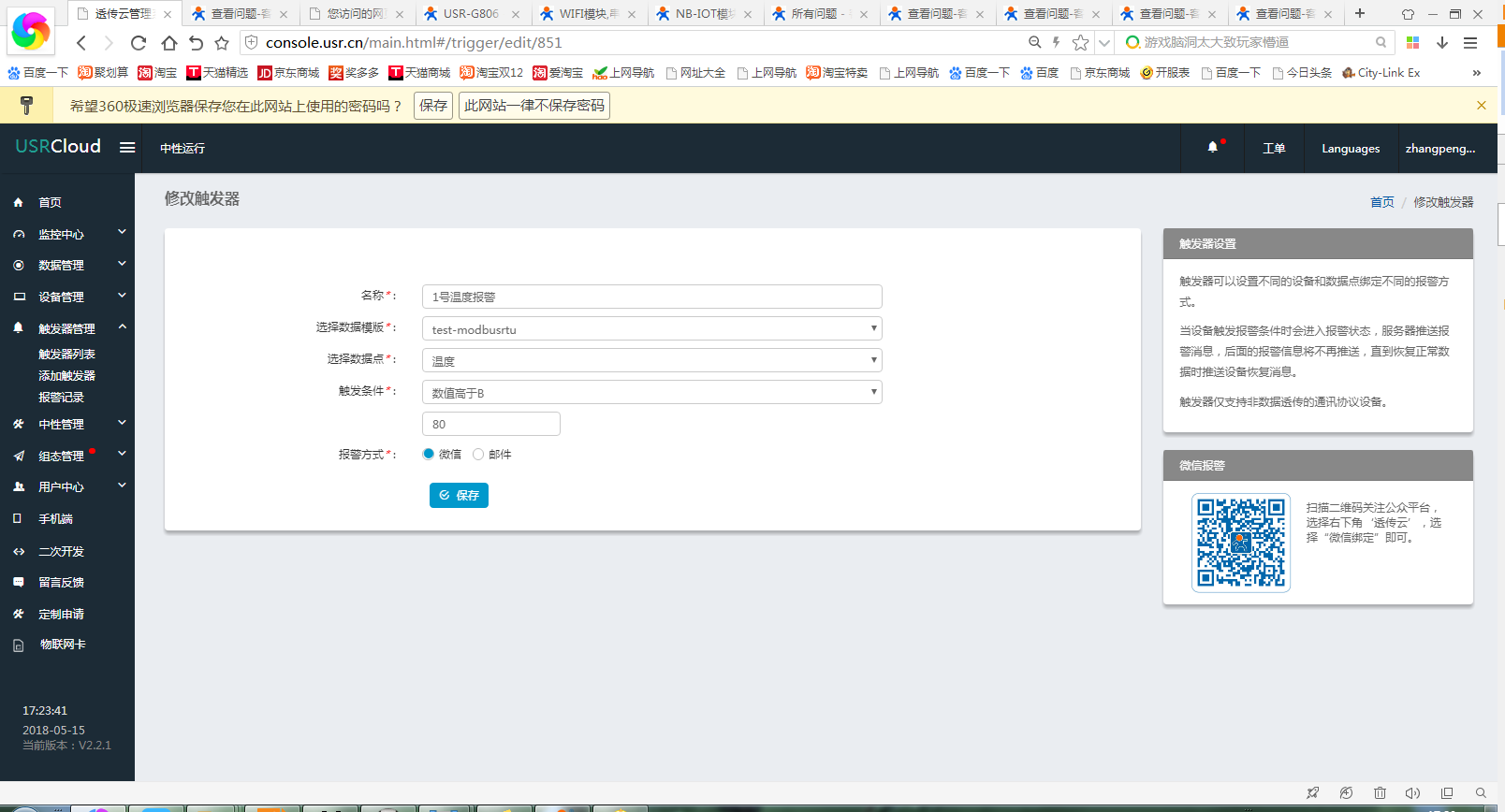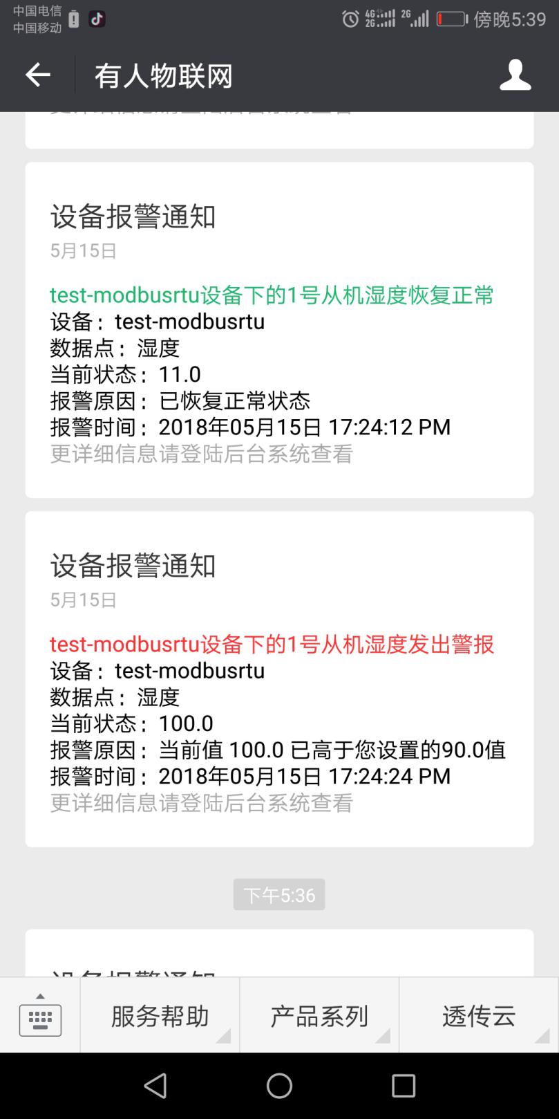 12、关注有人物联网公众号,点击右下角透传云,登录账号,报警信息可以推送至微信