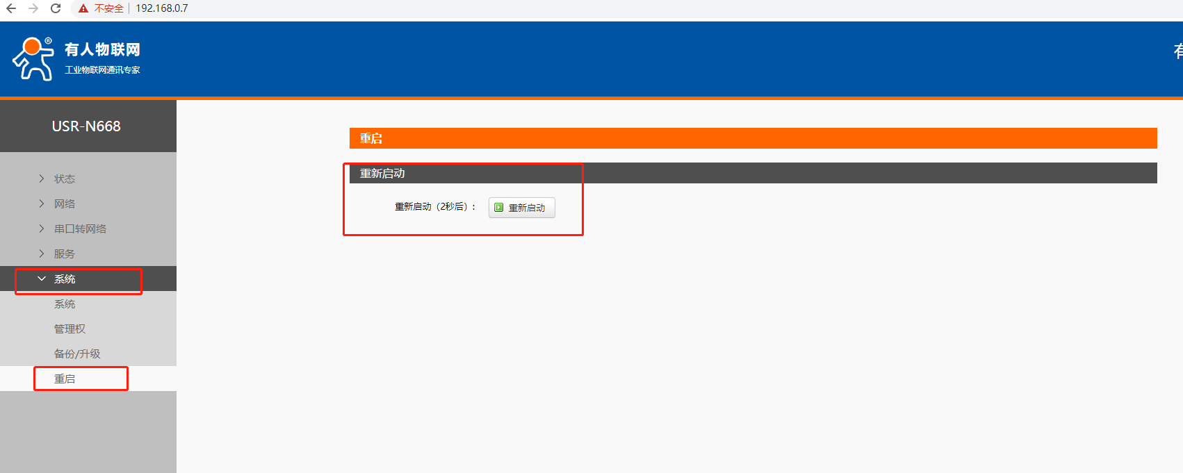 4、打开浏览器,浏览器输入IP:192.168.0.7进入N668的内置网页,用户名密码默认为admin,模块工作方式设为TCP SERVER,本地端口5523,点击保存参数。重启设备完成设置。