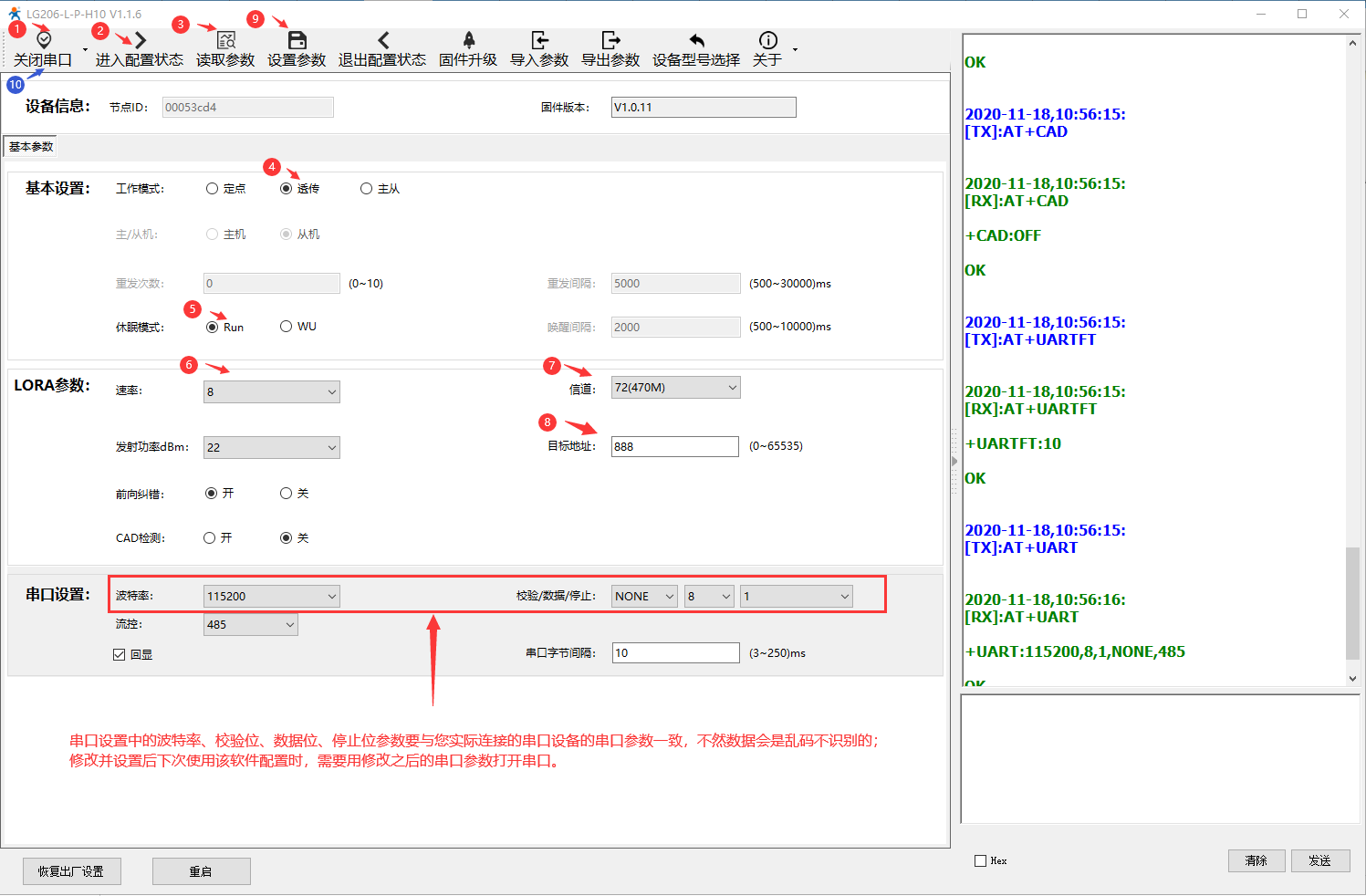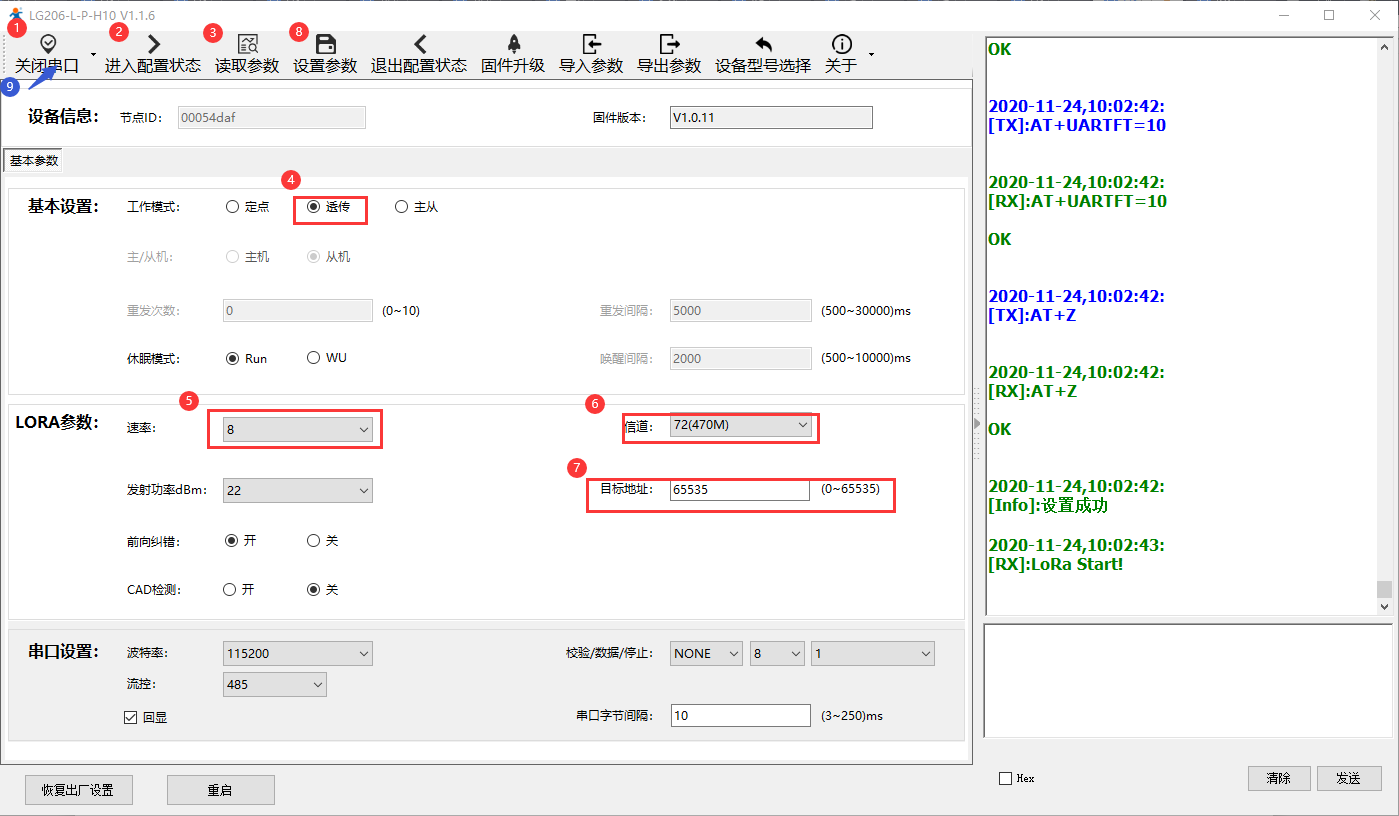广播设备参数:透传模式,速率等级8,信道72,目标地址65535。