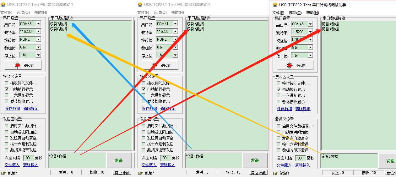 启动三个USR-TCP232-Test(模拟串口设备1,2,3)分别连接LoRa数传广播端A、接收端B、C的串口,使用串口设备1发送数据,串口设备2、3可接收数据,设备2、3的数据可以发送给设备1,通信效果如下图所示: