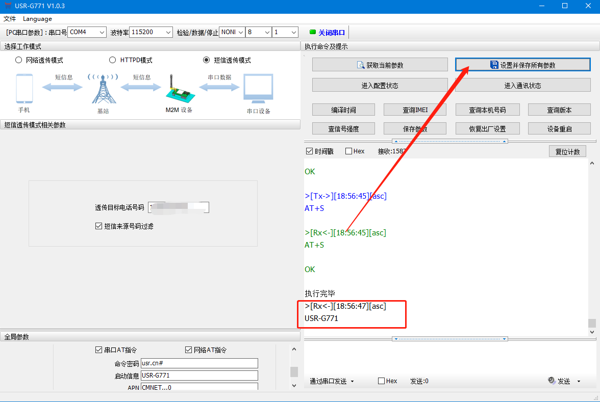 (2)打开串口——进入配置状态——设置工作模式为短信透传,设置目标手机号——设置并保存所有参数——串口打印开机信息说明设备重启成功