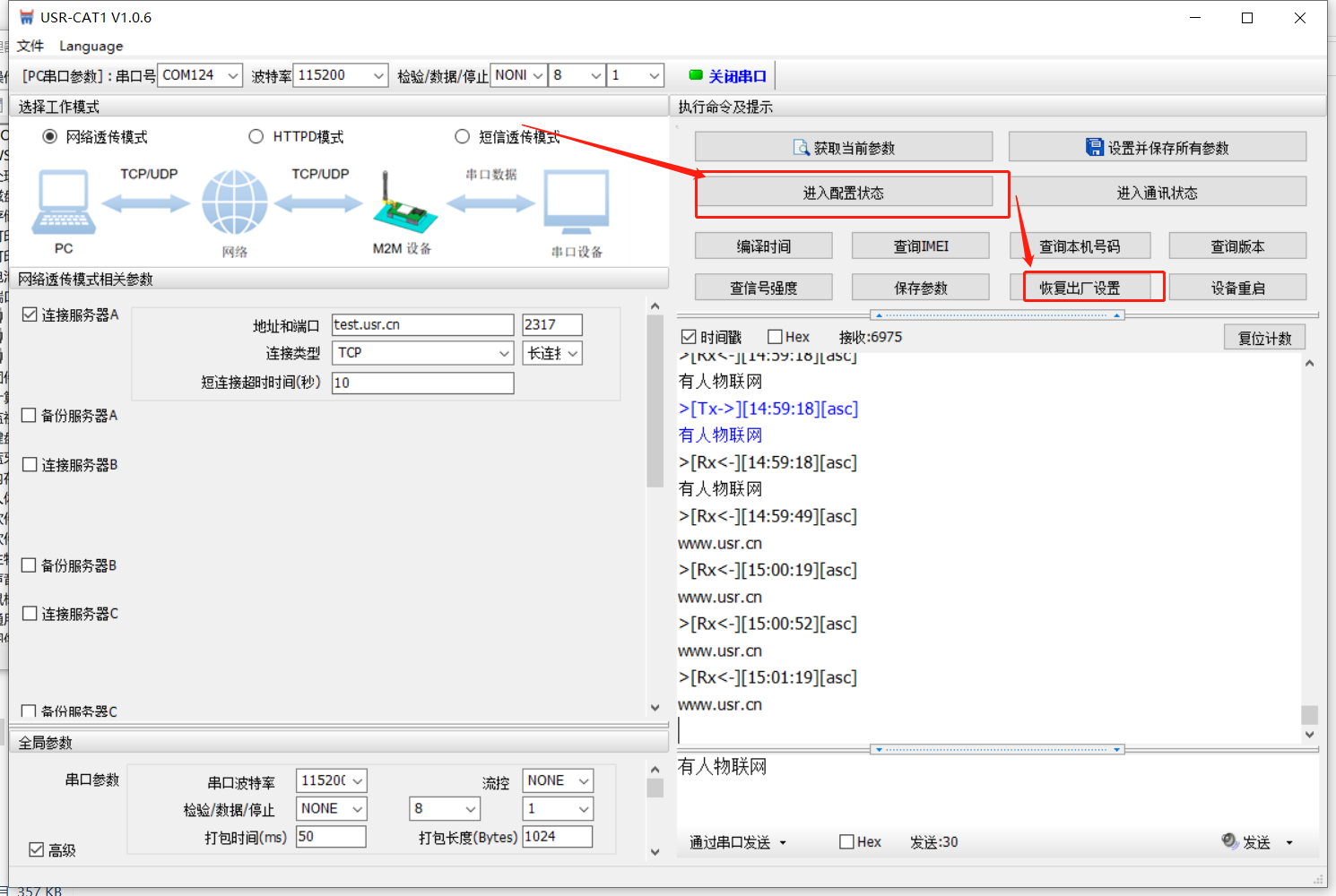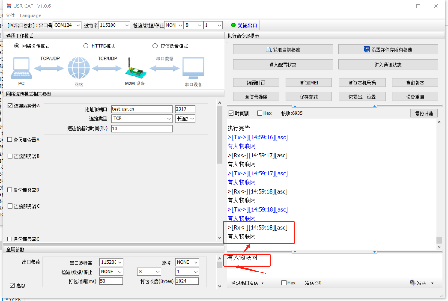 (4)模块出厂默认连接的是我司的测试服务器:test.usr.cn:2317;串口向服务器发送什么数据,服务器就将接收到的数据返回到串口。