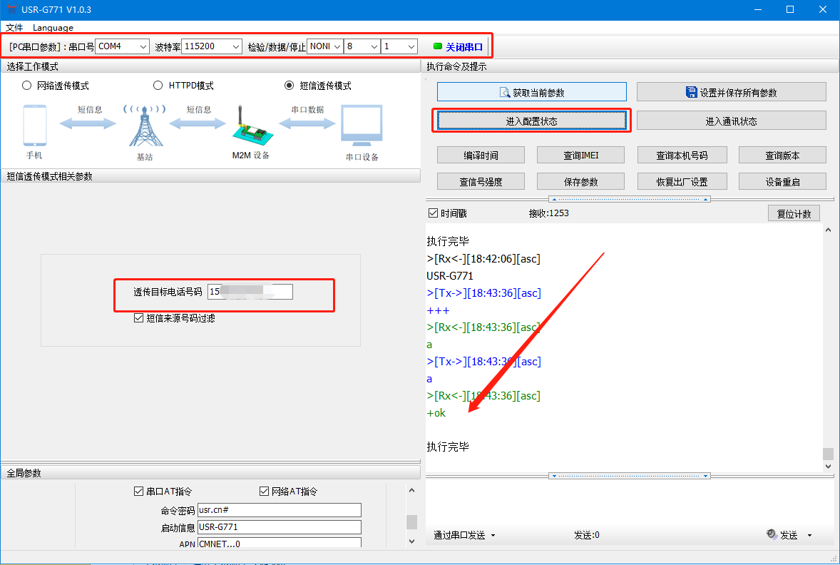 (2)打开串口——进入配置状态——设置工作模式为短信透传,设置目标手机号——设置并保存所有参数——串口打印开机信息说明设备重启成功