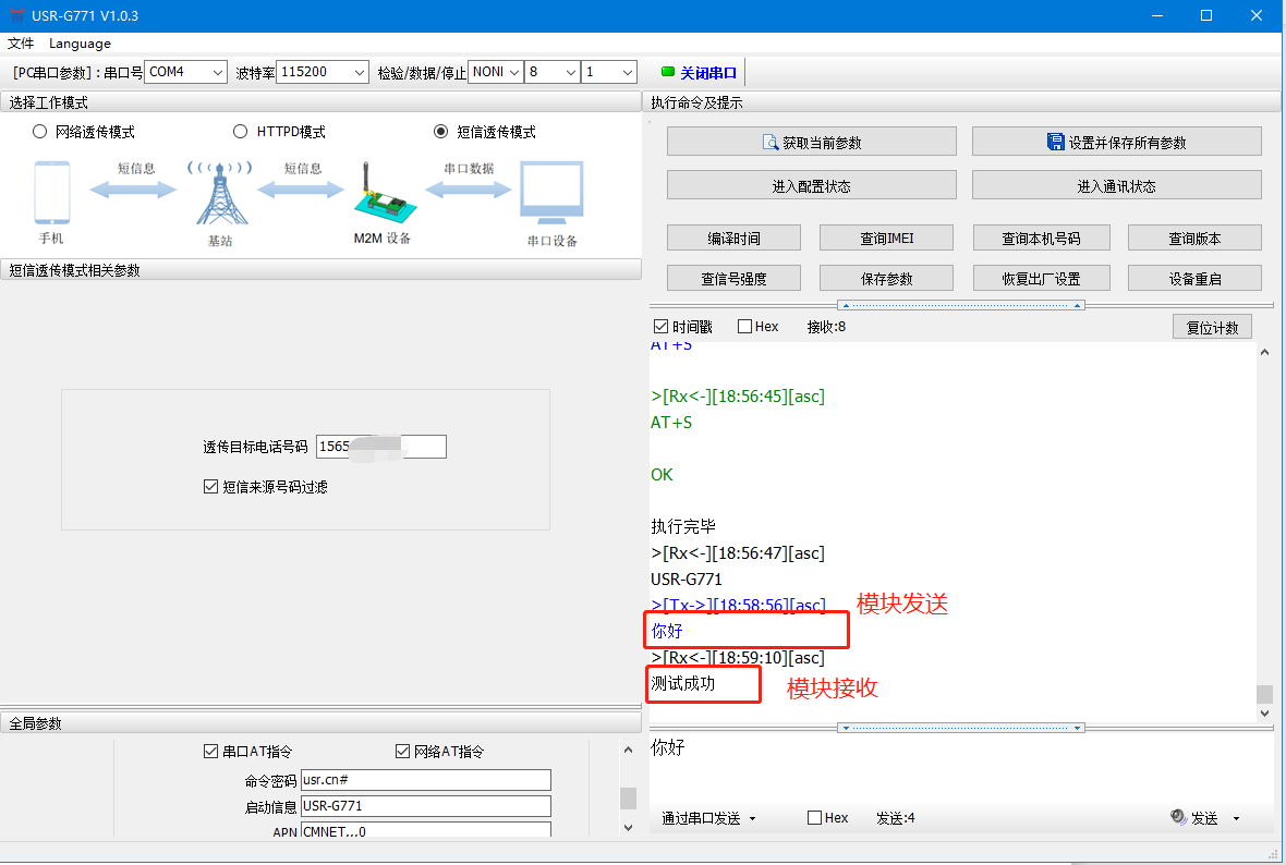 我们从目标手机号发送数据“测试成功”,可以看到在模块的串口端接收到了该数据