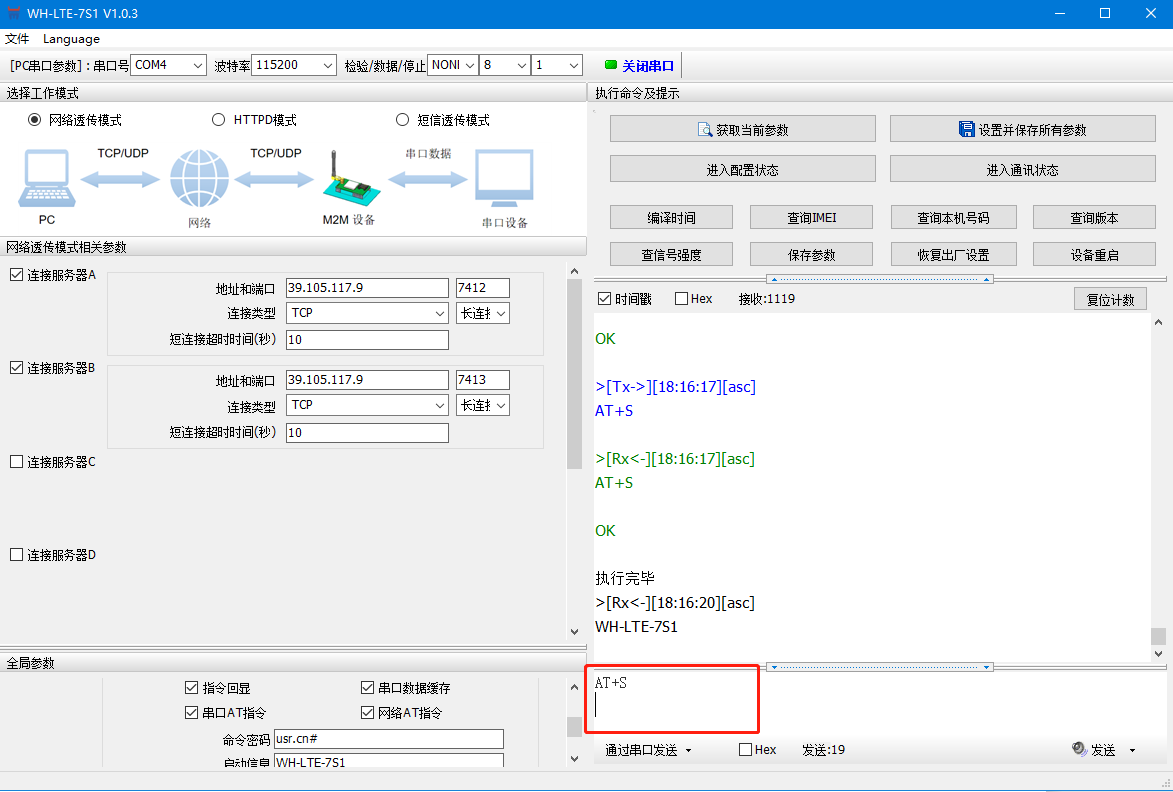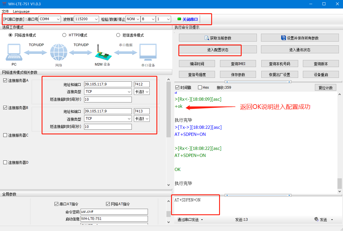 注:点击进入配置状态,如果模块能返回+ok的字符,说明电脑和模块连接是没有问题的