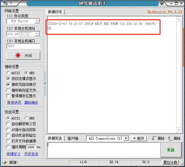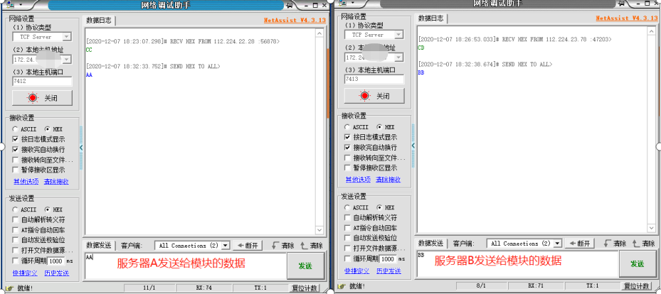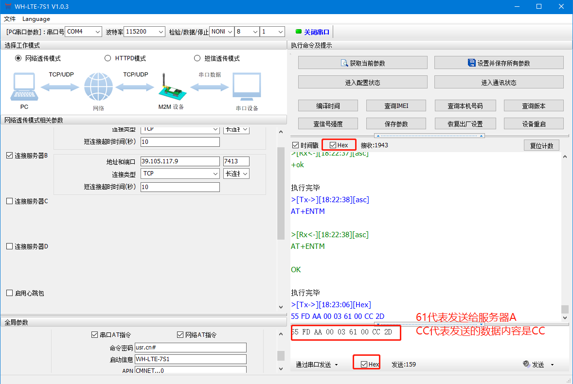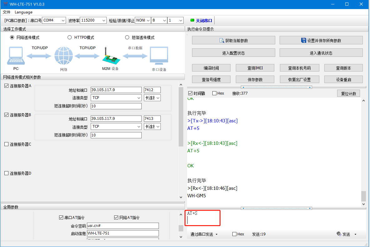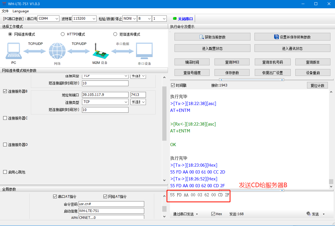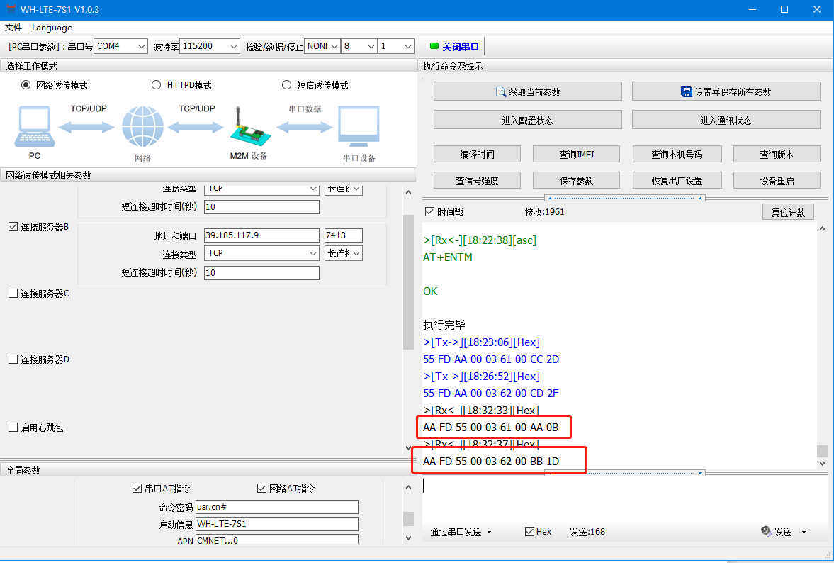 4、重启后,模块会主动连接服务器,通过串口发送指定格式的数据出去。