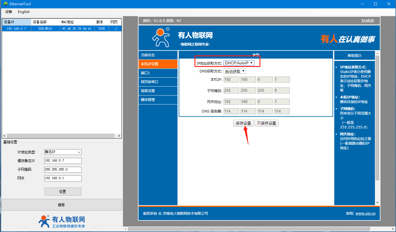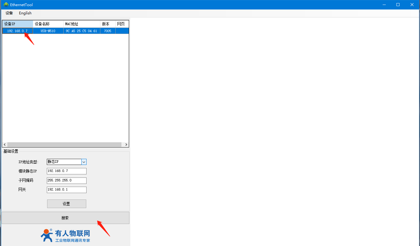 4、打开510(H7)系列设置软件,点击搜索设备,可以搜索到510,并且可以看到目前510的相关信息,IP为192.168.0.7(默认),设备名称为:USR-N510,MAC地址为:9C A5 25 XX XX XX,版本为:7005。