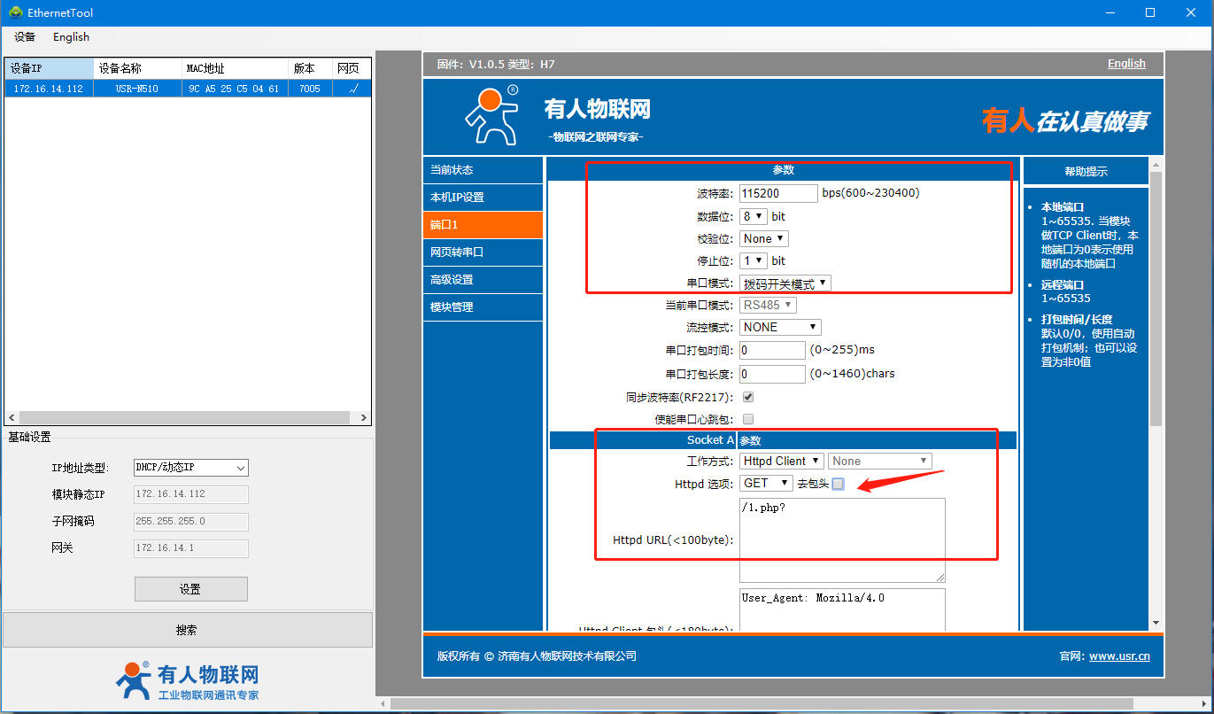 USR-N510(H7)HTTP GET模式通信案例