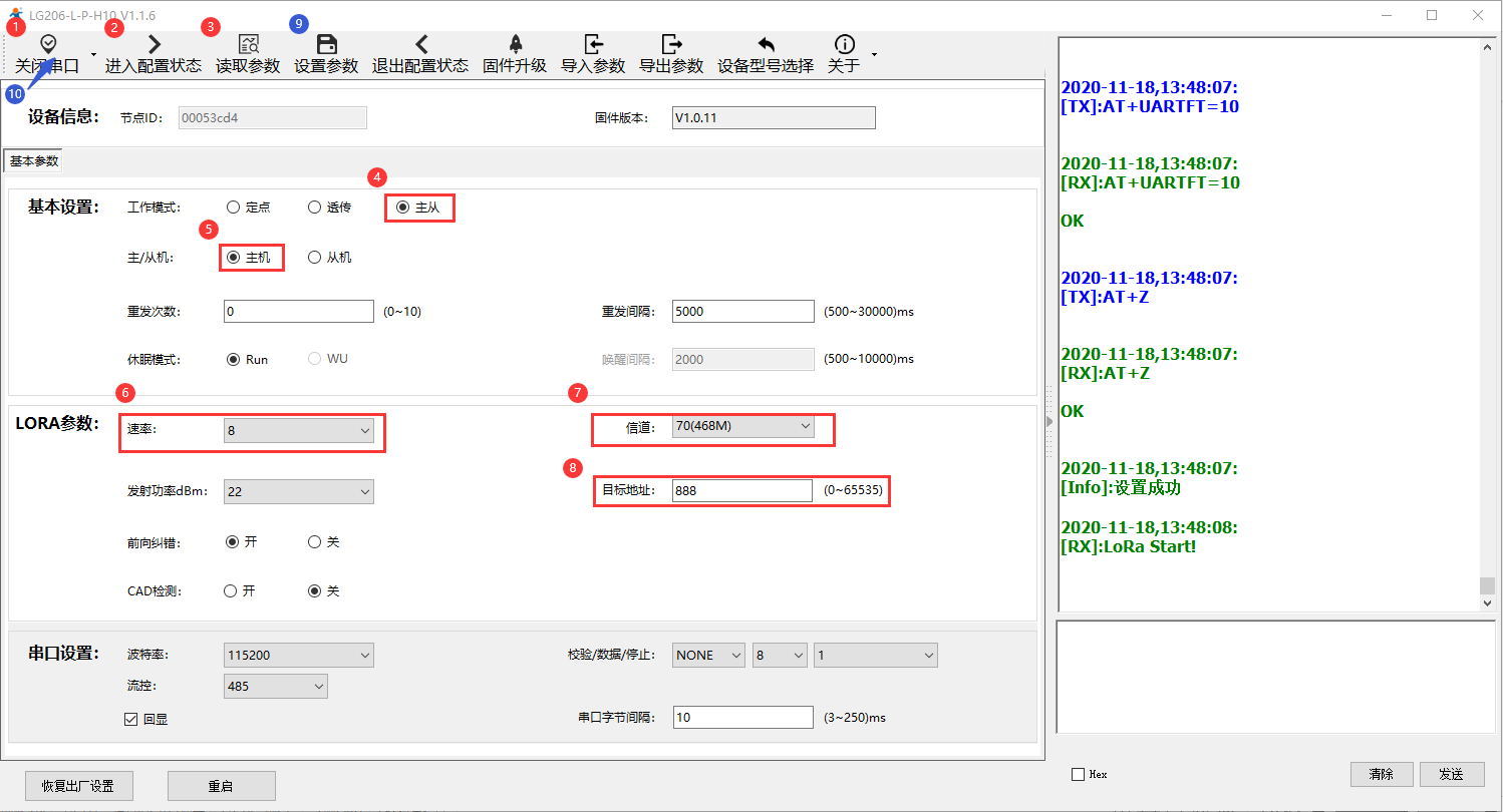 打开LoRa设置软件,选择LG206-L-P-H10,依次点击打开串口(选择A、B对应的串口号,串口参数:115200,None,8,1,NFC)、进入配置状态、读取参数、配置上表中的参数、一键设置所有参数,关闭LoRa设置软件。