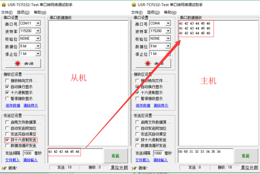 启动两个USR-TCP232-Test(模拟串口设备1,2)分别连接LoRa数传终端A、B的串口,使用串口设备1发送数据串口设备2可接收数据(反之亦然),