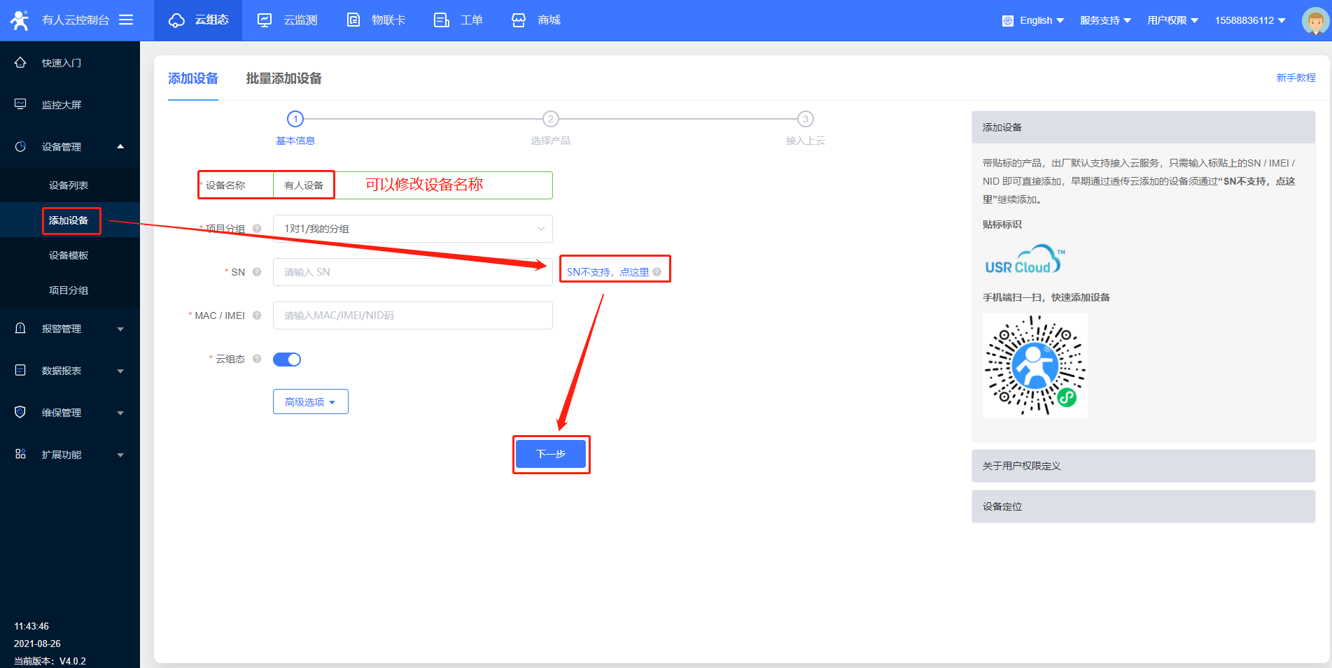2>云平台添加设备,G807选择“SN不支持,点这里”,用系统自动分配的编号和密码即可