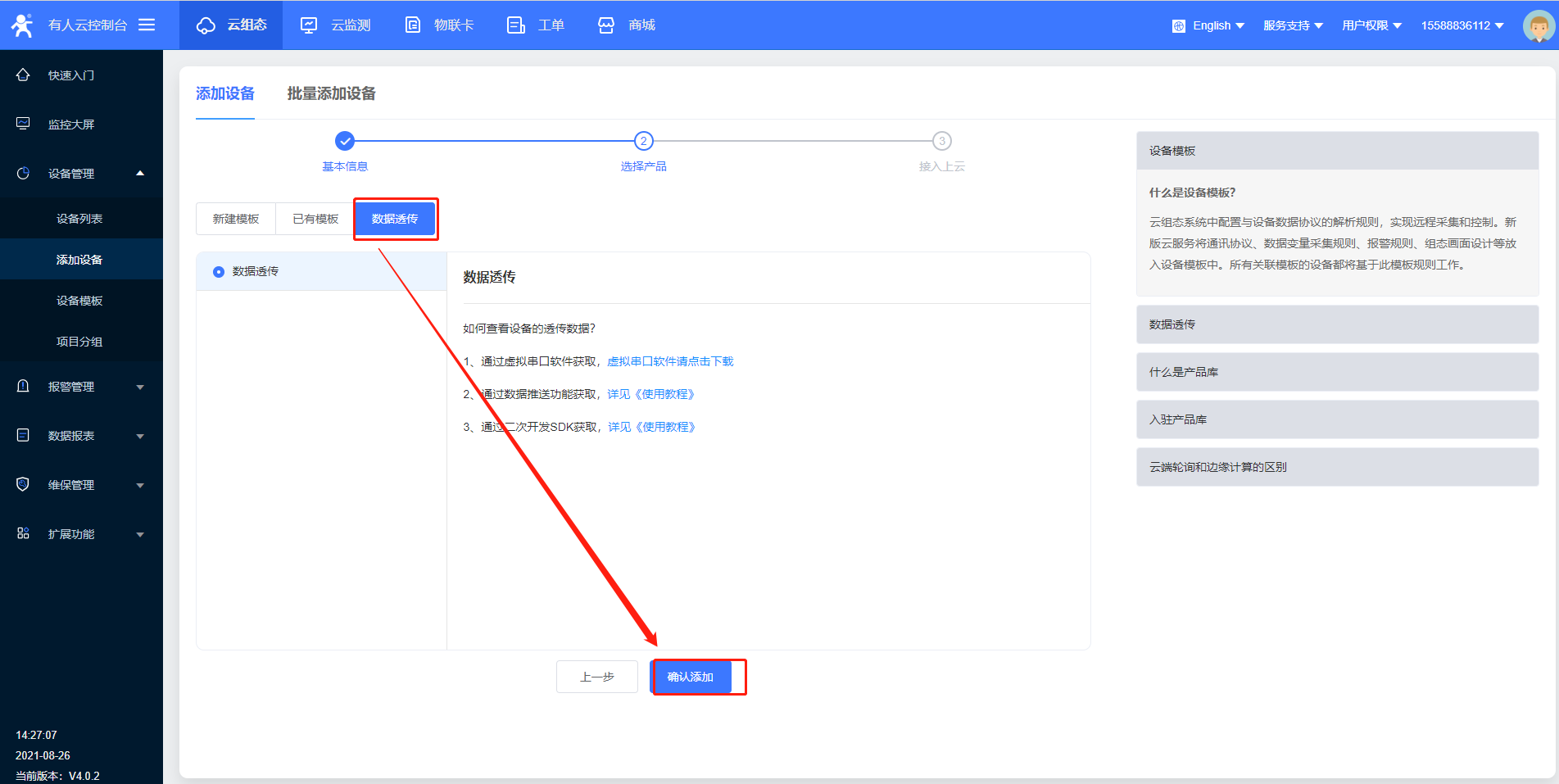 4>按照步骤2的方法再添加一个设备,用于分配给虚拟串口(注意:需要在云平台添加2个设备,一个对应G807,一个对应虚拟串口)