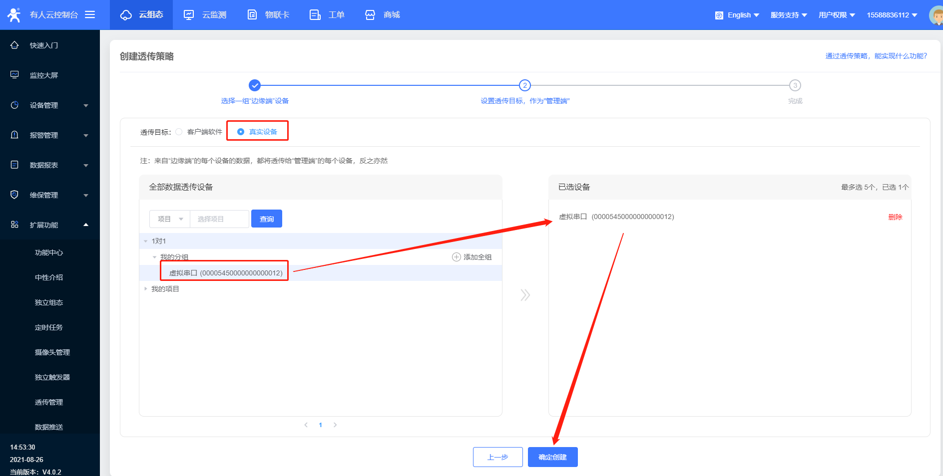 虚拟串口(PC端)发送数据--->有人云平台--->G807--->终端串口设备