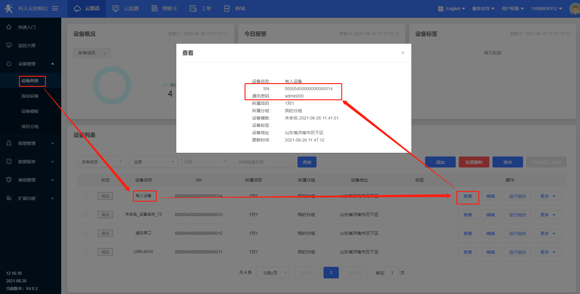 4>设置G807的注册包信息,设备编号和密码可以在云平台查询