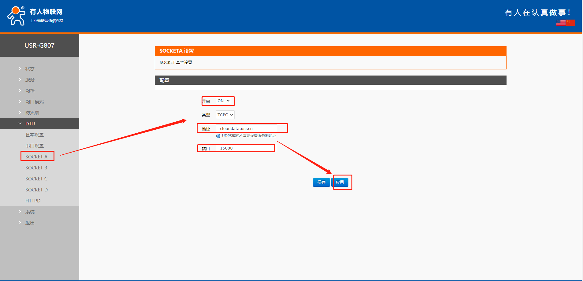 开启SOCKET功能,设置服务器的IP地址(clouddata.usr.cn)以及端口号(15000),然后点击应用