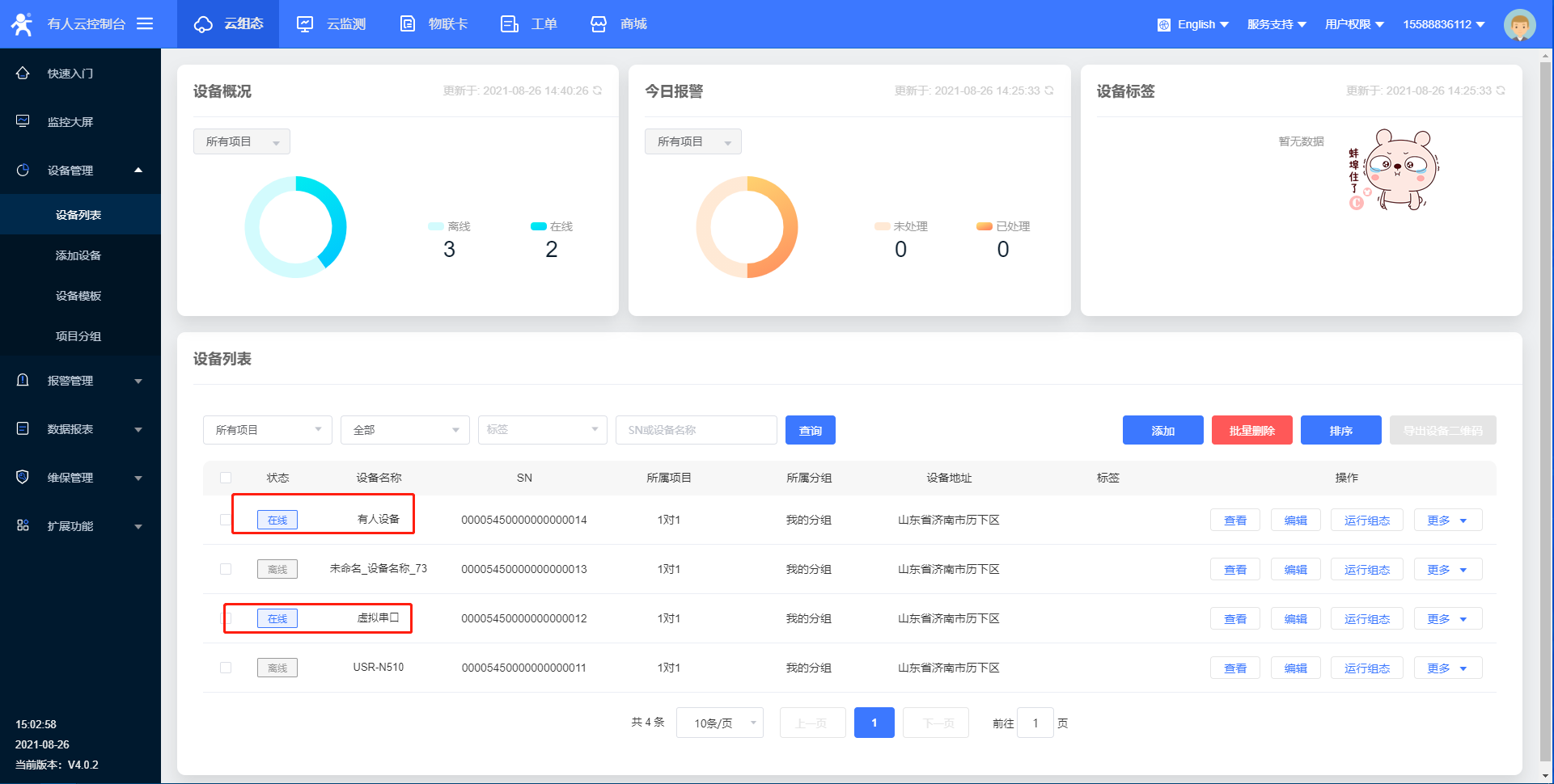启用透传云:设备编号和通讯密码见下图,直接复制到虚拟串口软件的编号和密码即可