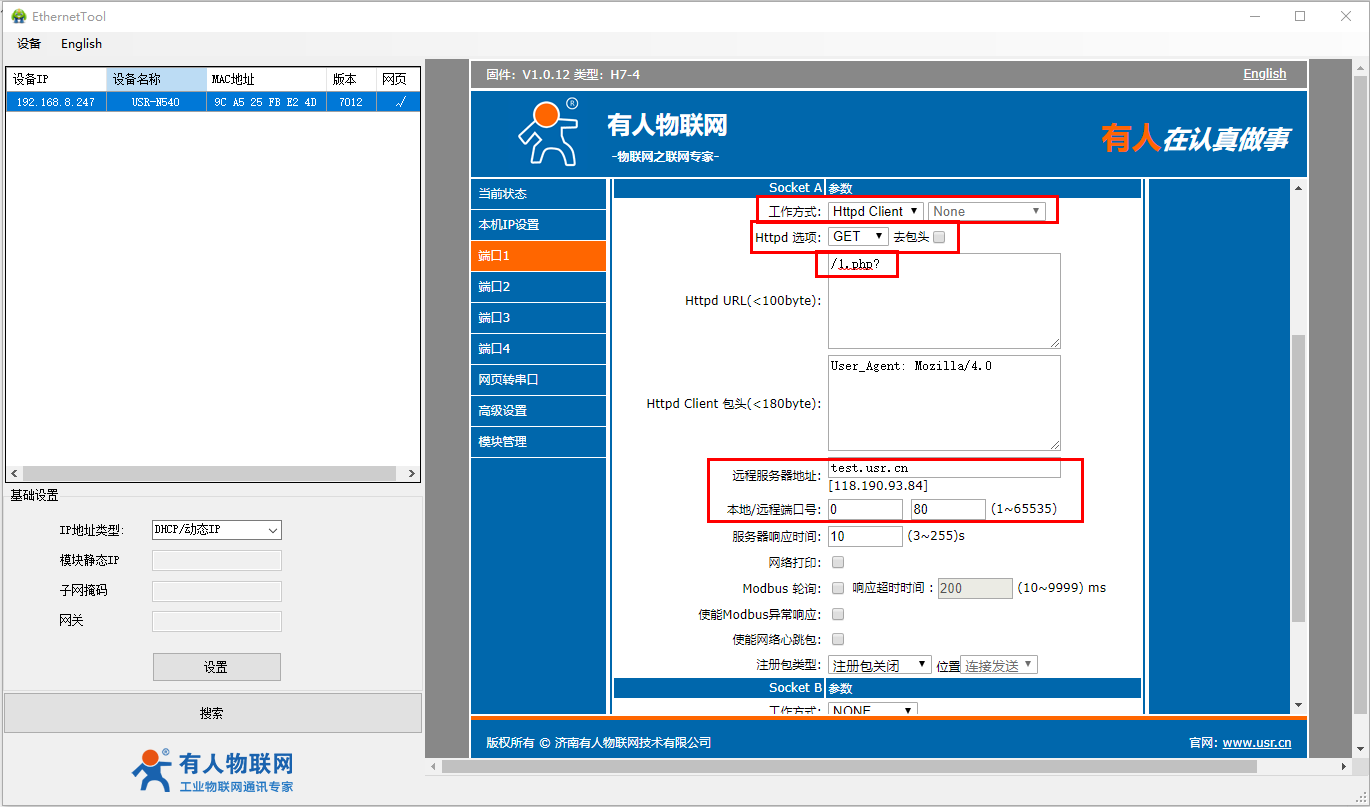 USR-N540-H7 HTTPD GET模式测试案例