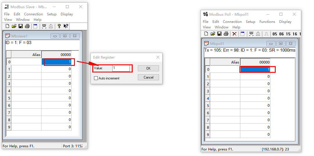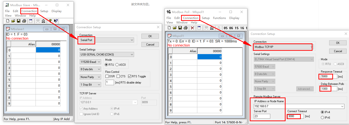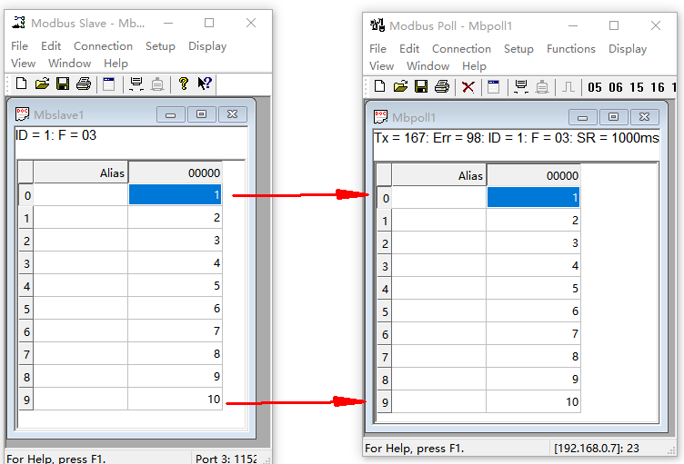 模拟测试用MODBUS SLAVE软件做串口设备,用MODBUS POLL软件做网络端。