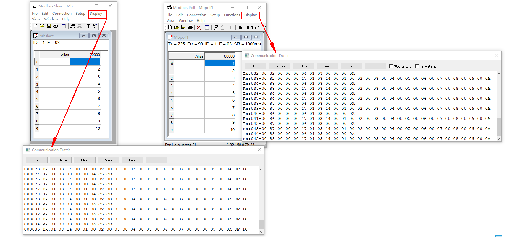 备注:MODBUS SLAVE软件和MODBUS POLL软件的选项Display,点开之后,最下面的Communication Traffic,是两个软件数据监控,可以查看MODBUS 数据,是否正常。
