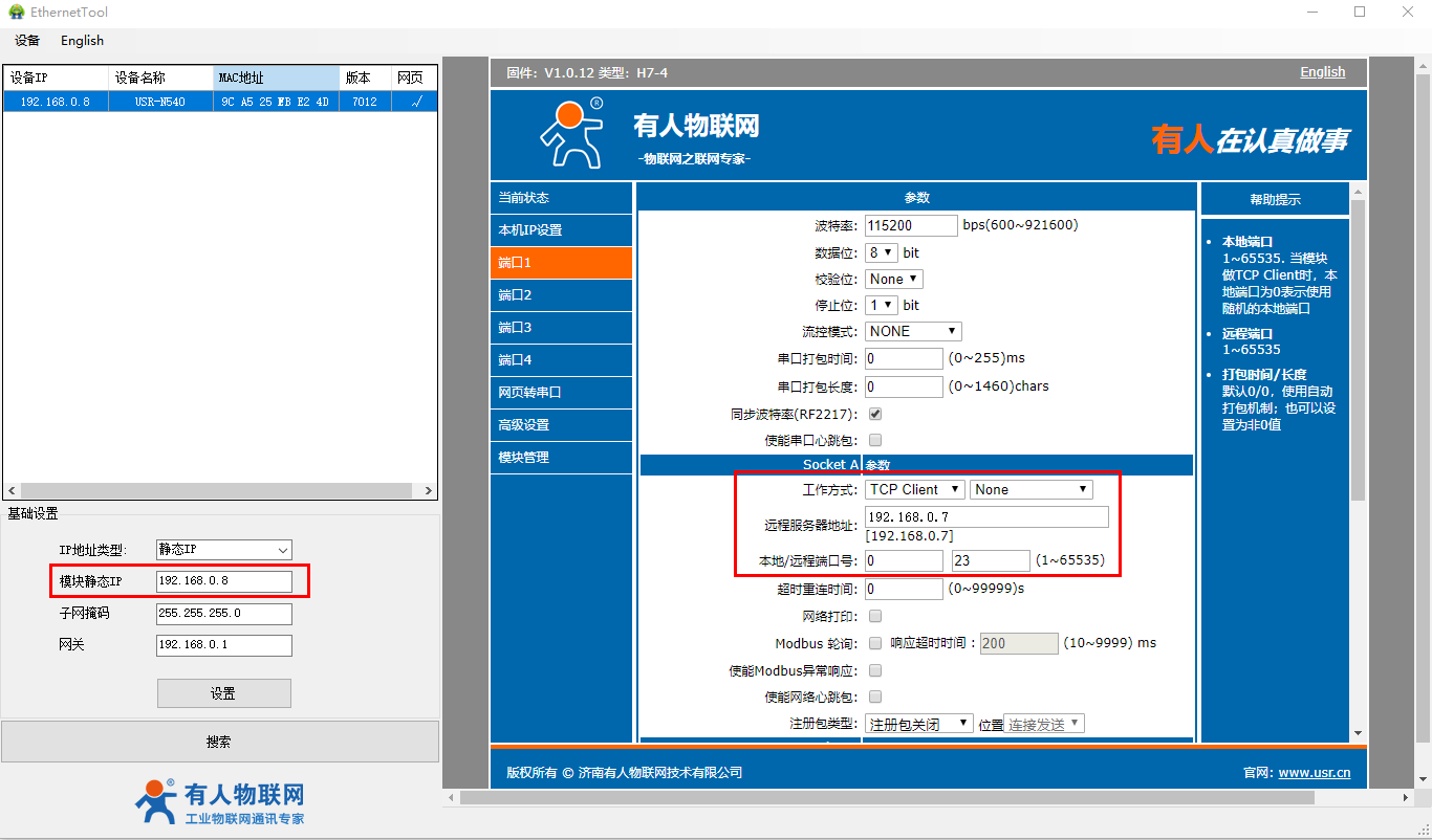 工作方式设置TCP client,远程服务器地址填192.168.0.7,远程端口填23。本地端口填0。