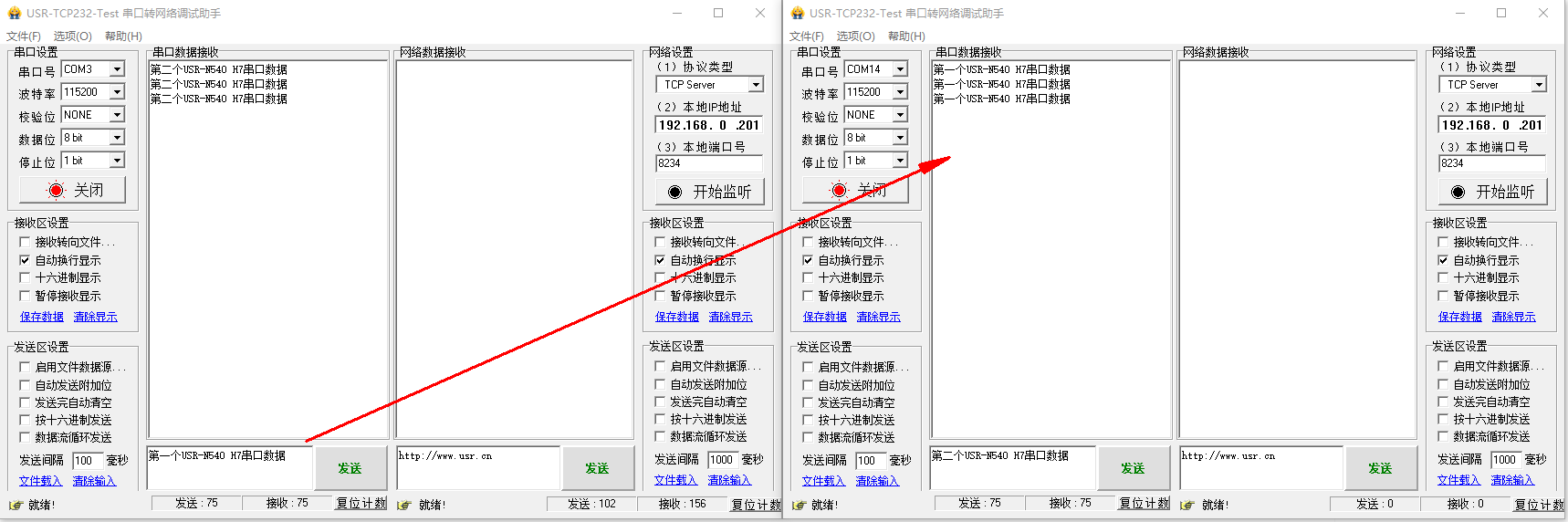 两个N540的2个网口用一根网线直连,两个N540的串口分别接USB-RS485串口线接电脑,打开2个串口助手,对应各自N540串口参数。