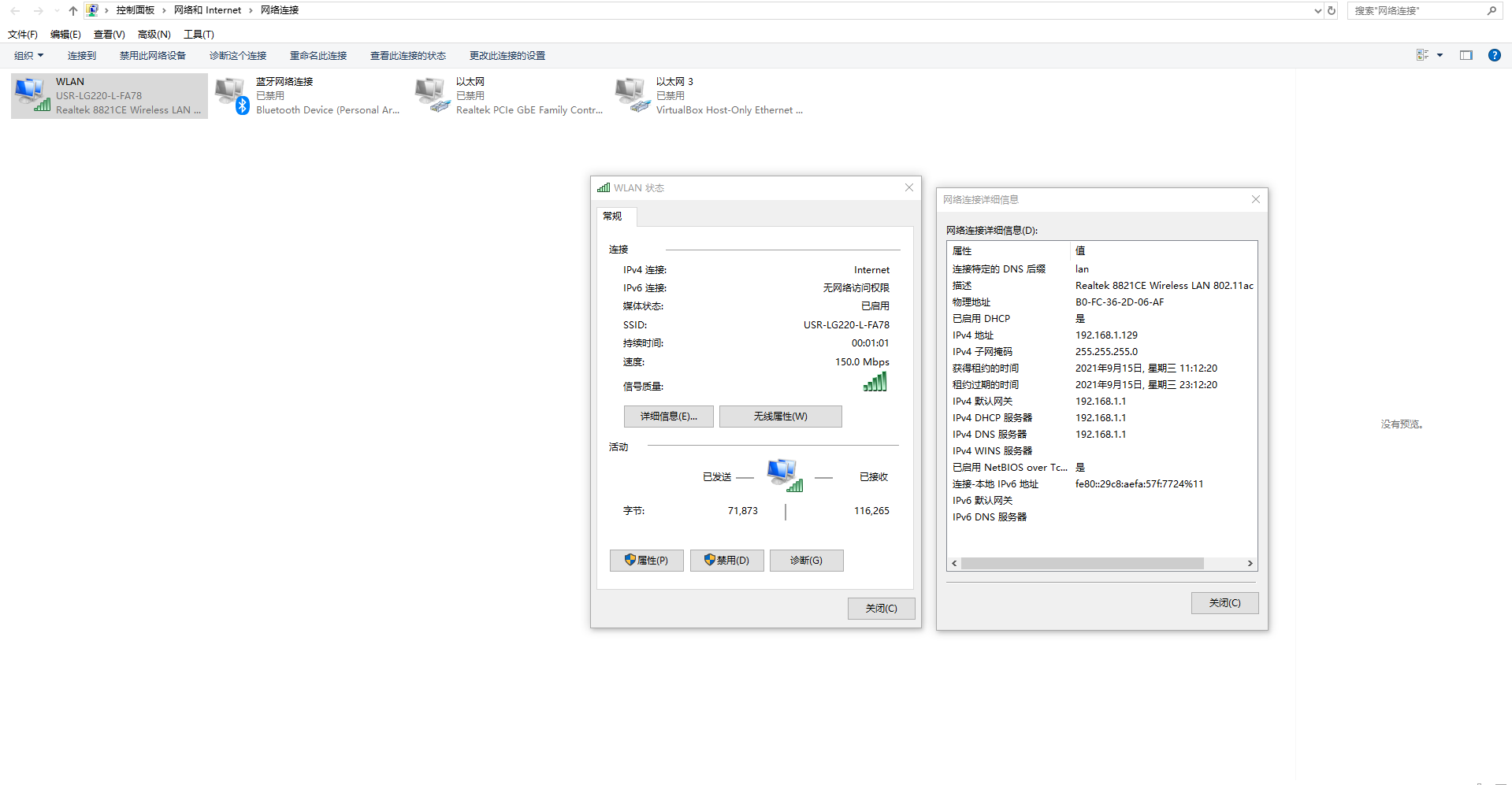 1、电脑连接USR-LG220-L的WiFi,可以从控制面板看到USR-LG220-L分配给电脑的IP和网关。关闭防火墙。