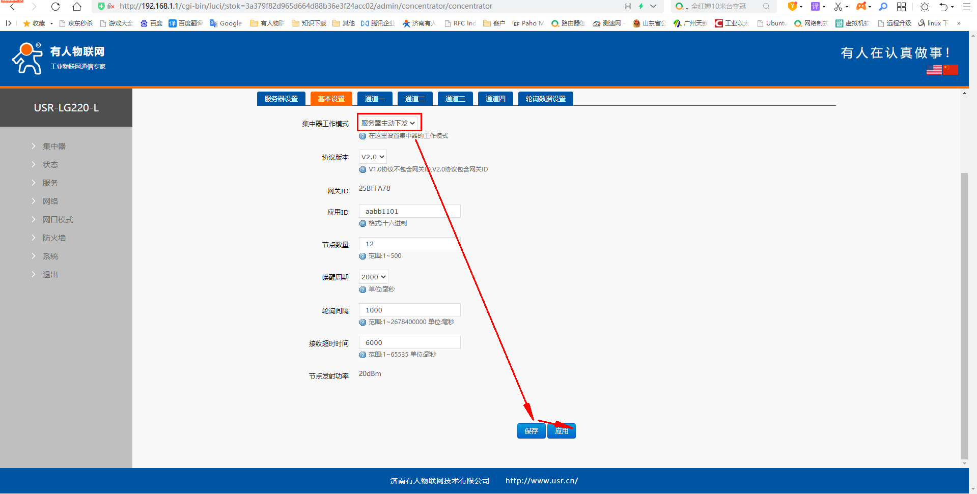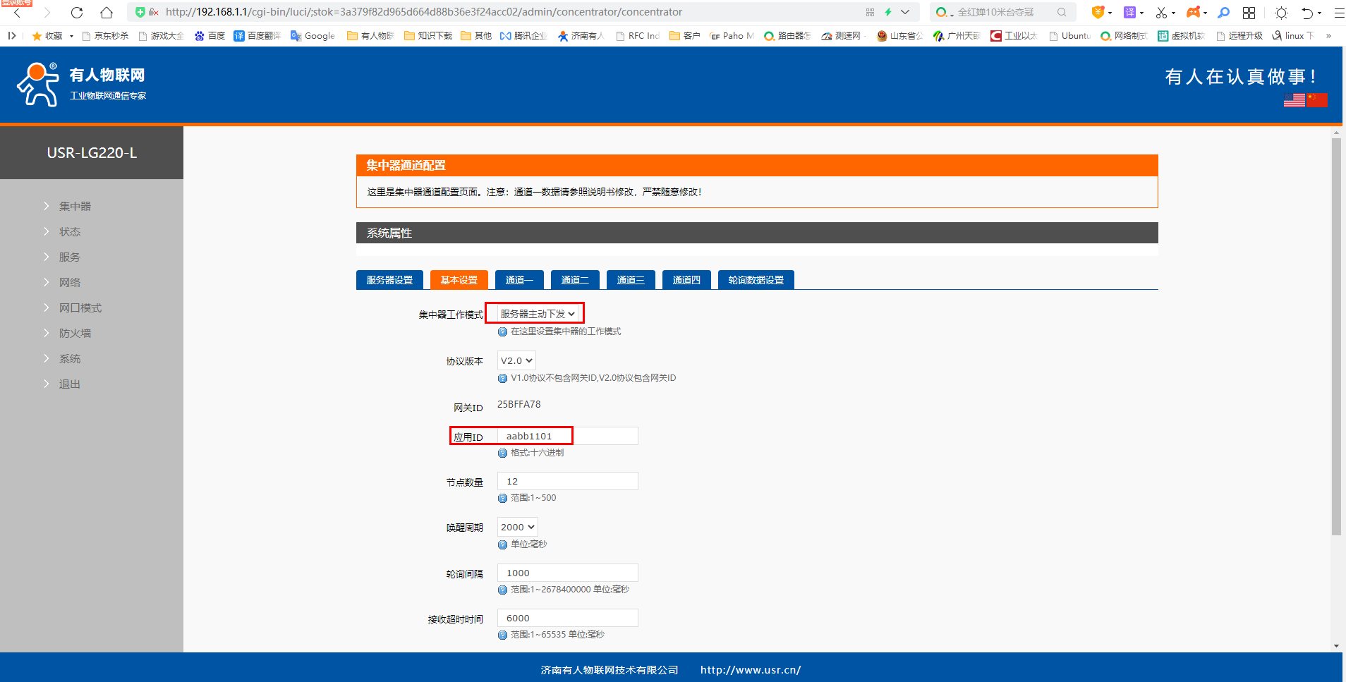 AID应用ID设置为aabb1101,设置和USR-LG220-L的应用ID一致。