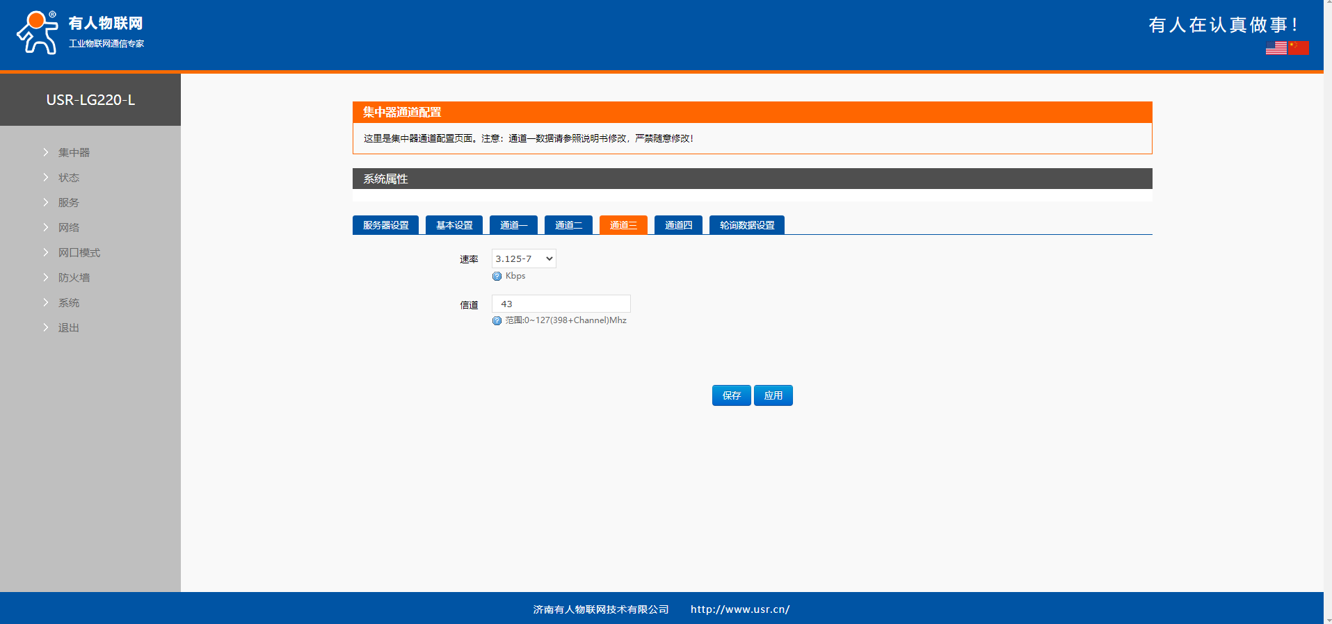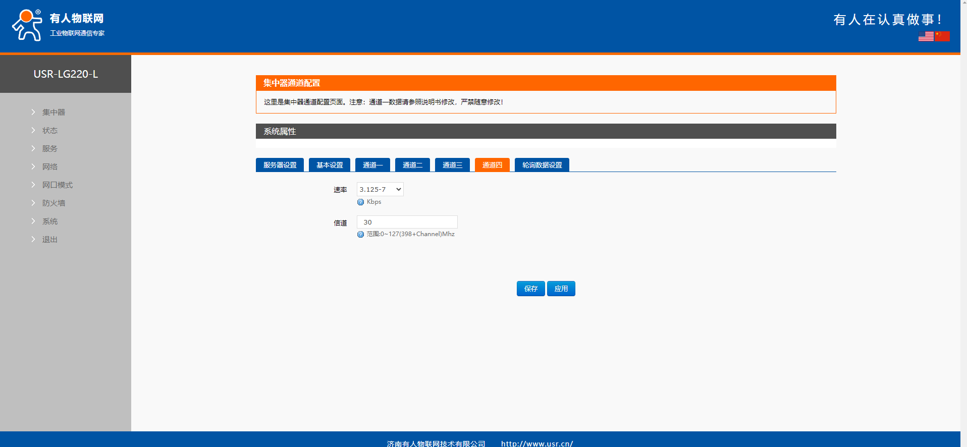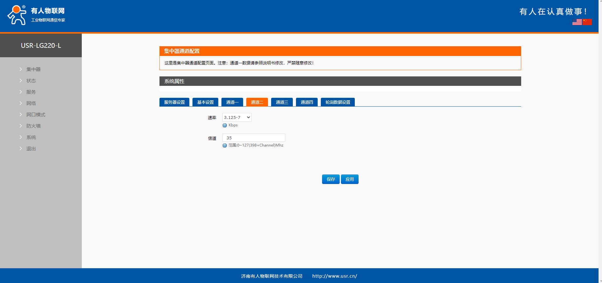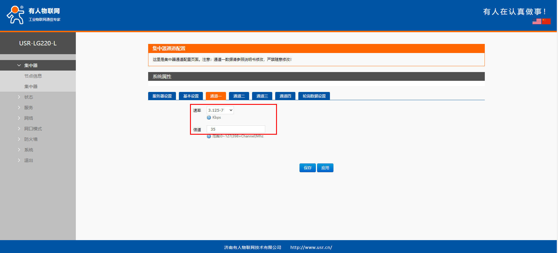 3、修改USR-IO34-LR-C的空中速率等级,设置为7。信道设置为35,和USR-LG220-L的通道一速率、信道保持一致。
