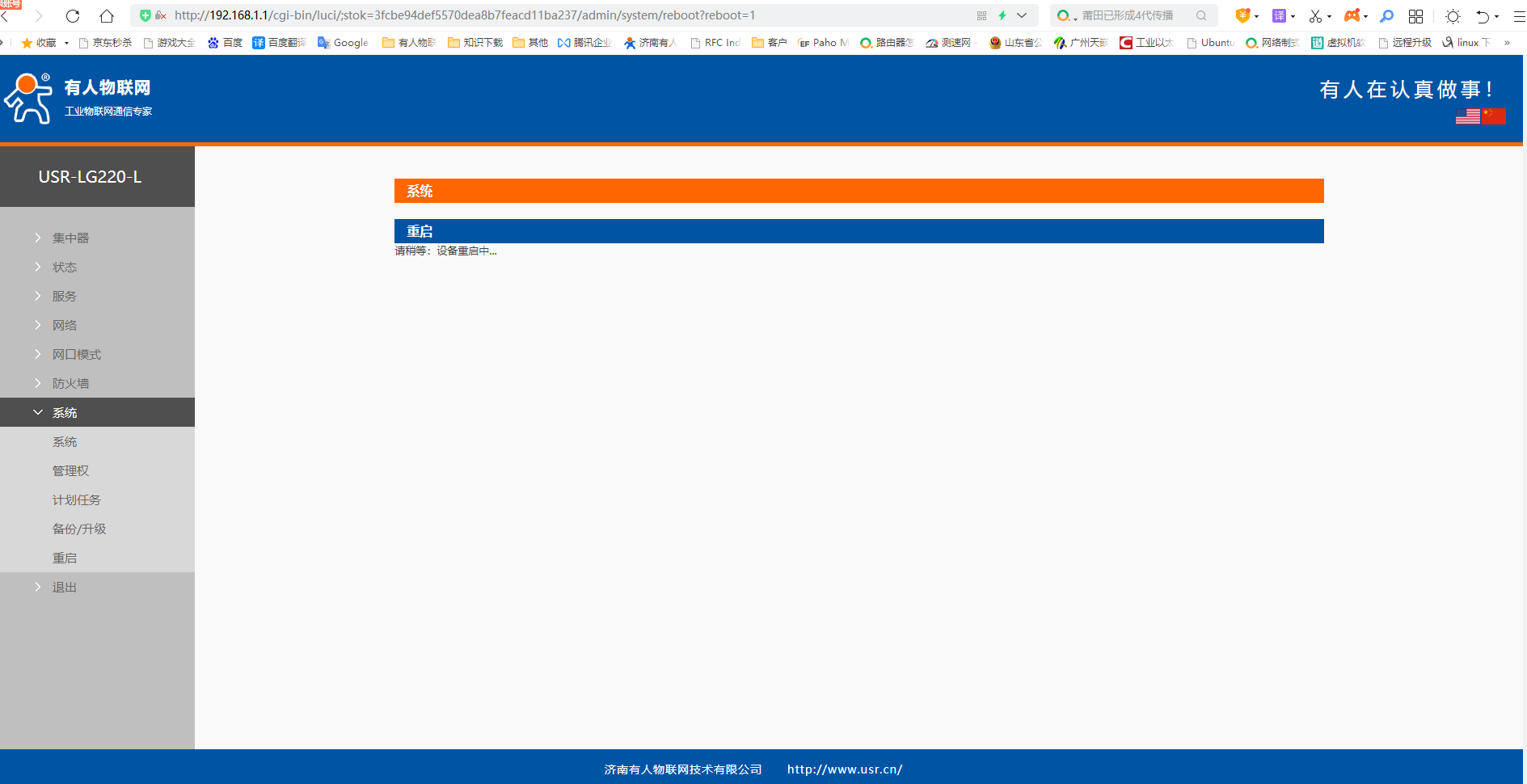 4、USR-LG220-L网页系统,点击重启,执行重启。等待一段时间,等待USR-LG220-L重启完毕。