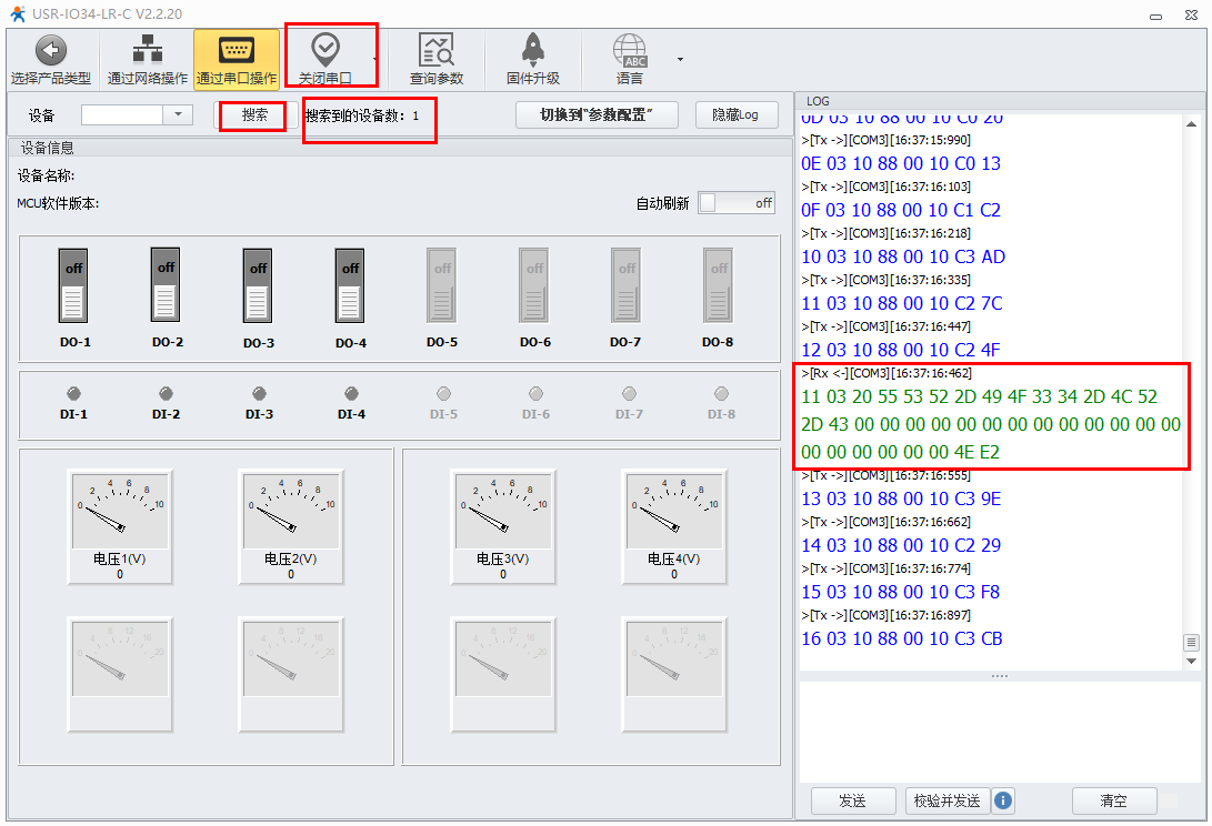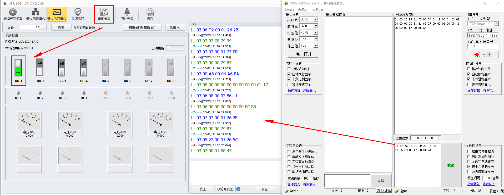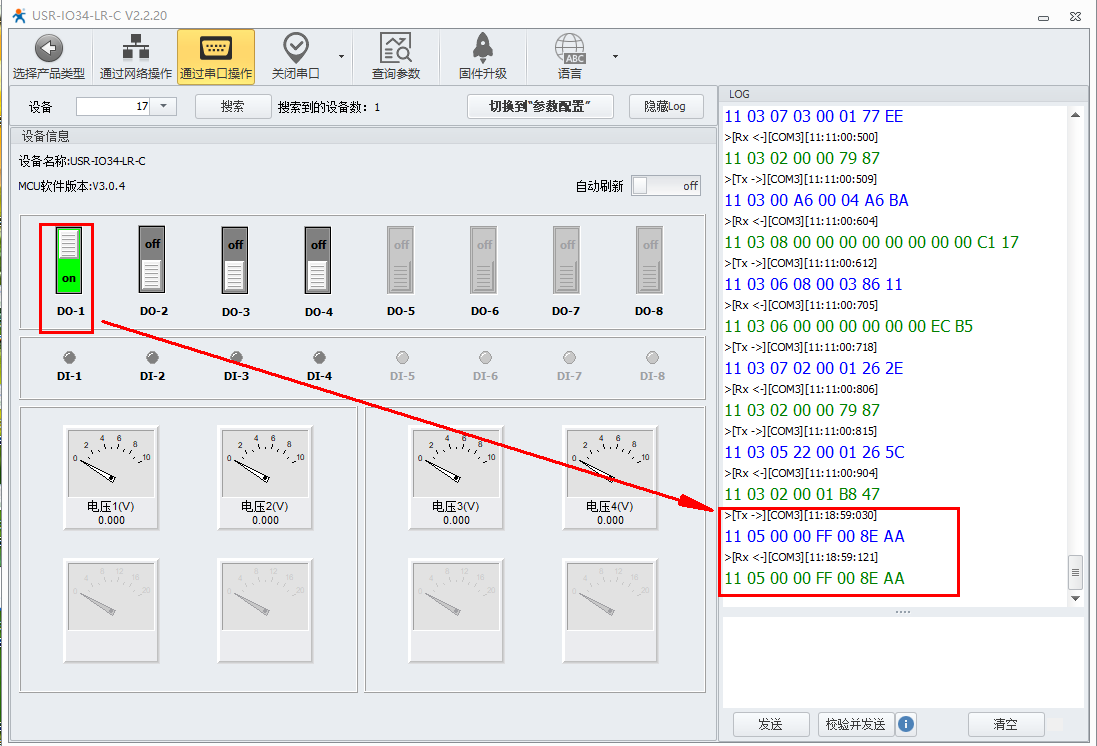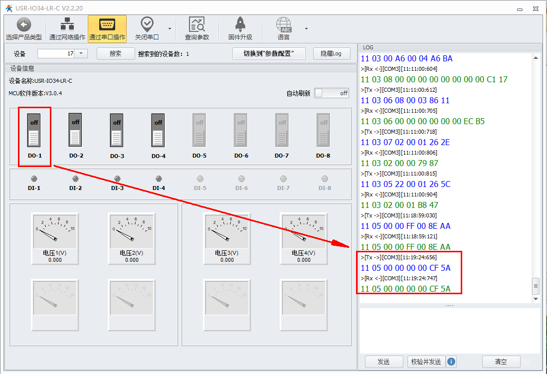 1、USR-IO34-LR-C 使用USB-RS485打开配置软件,对DO-1进行开启和关闭操作,配置软件右侧对话框,记录对应的MODBUS RTU命令。