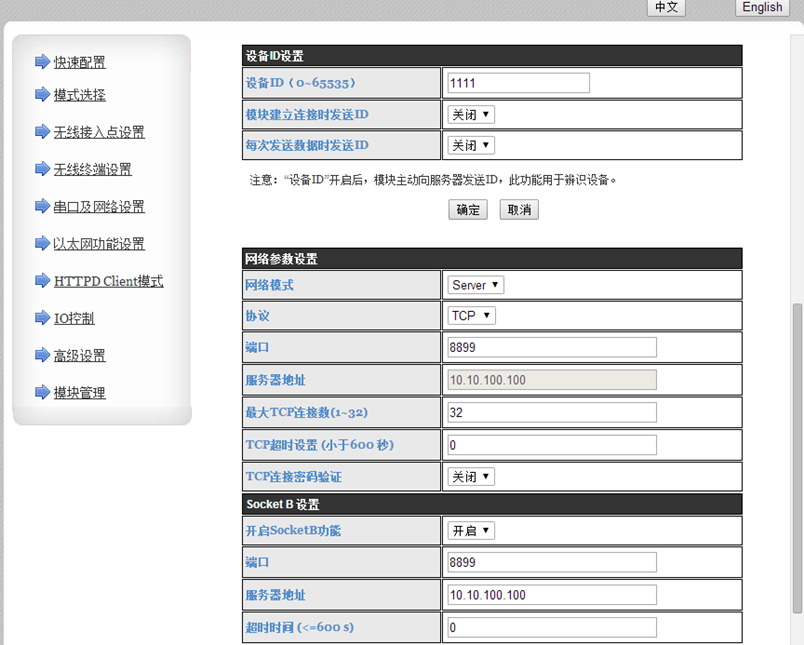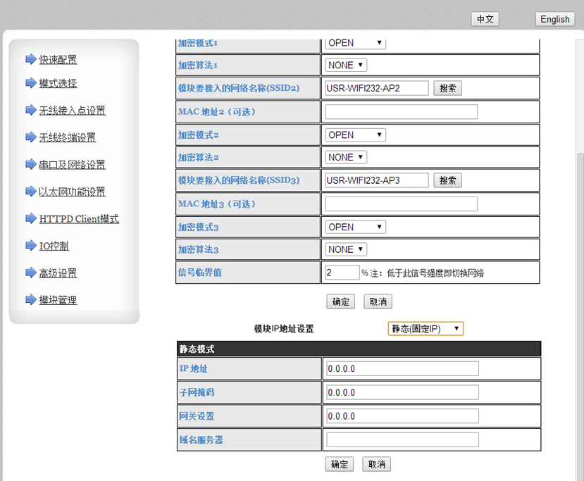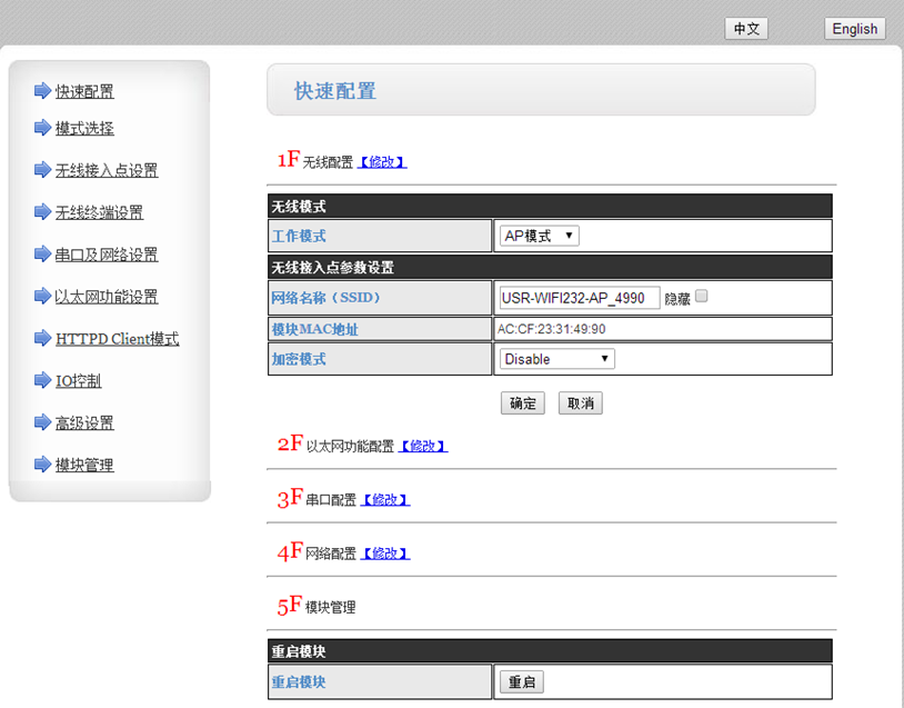 1:快速配置页面,可以完成最基本的配置,AP配置,STA连接网络配置,网络协议配置等快捷配置。