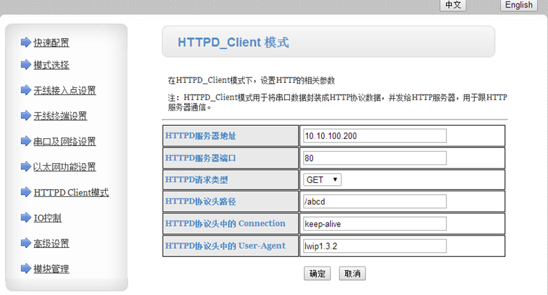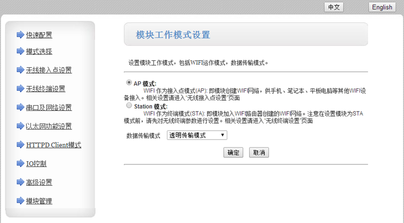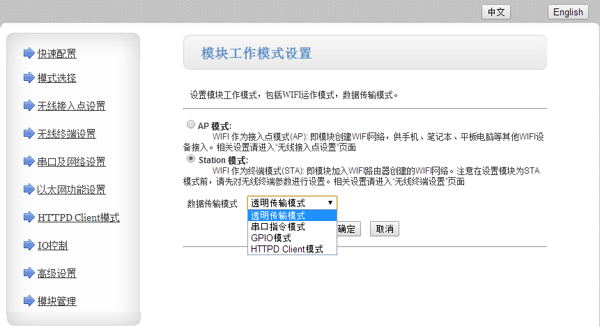 3:数据传输方式支持:透传模式(一般通信方式为透传,不理解最好不要选择),串口指令,GPIO模式,HTTPD client(网页页面可以设置请求方式)
