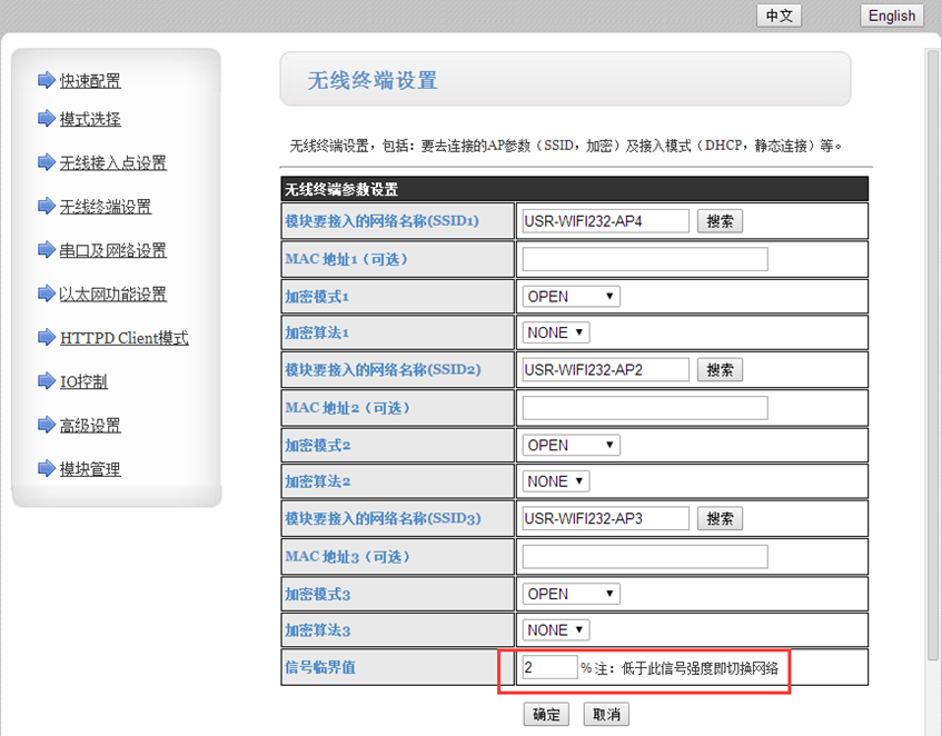 可以设置信号临界值,用于切换SSID,切换方式是根据信号临界值切换,SSID1消失了,自动切换到SSID2,SSID2信号消失,自动切换到SSID3,以排序的方式切换。如果信号临界值设置为100就代表不切换SSID,默认为连接SSID1.