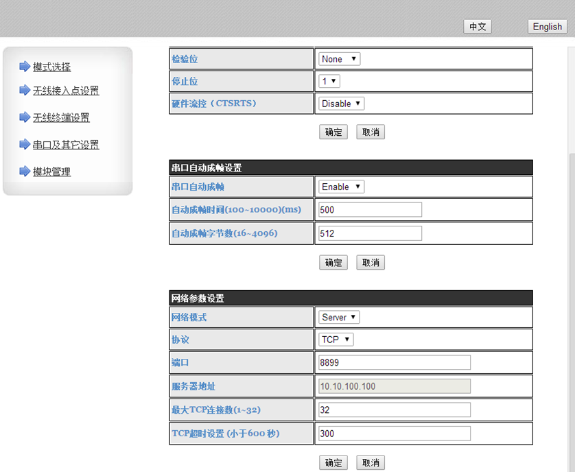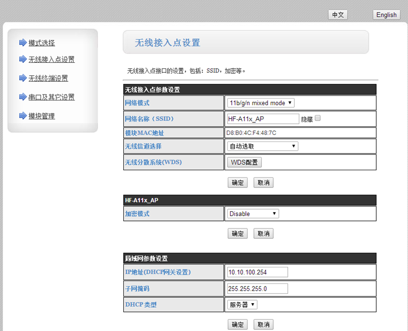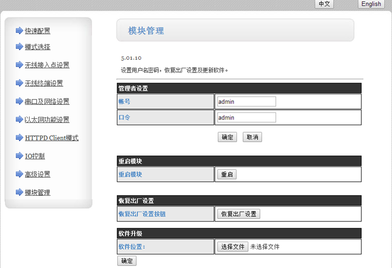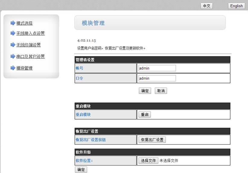 模块在AP模式下默认IP是10.10.100.254.在浏览器上输入此IP。用户名和密码都是admin。