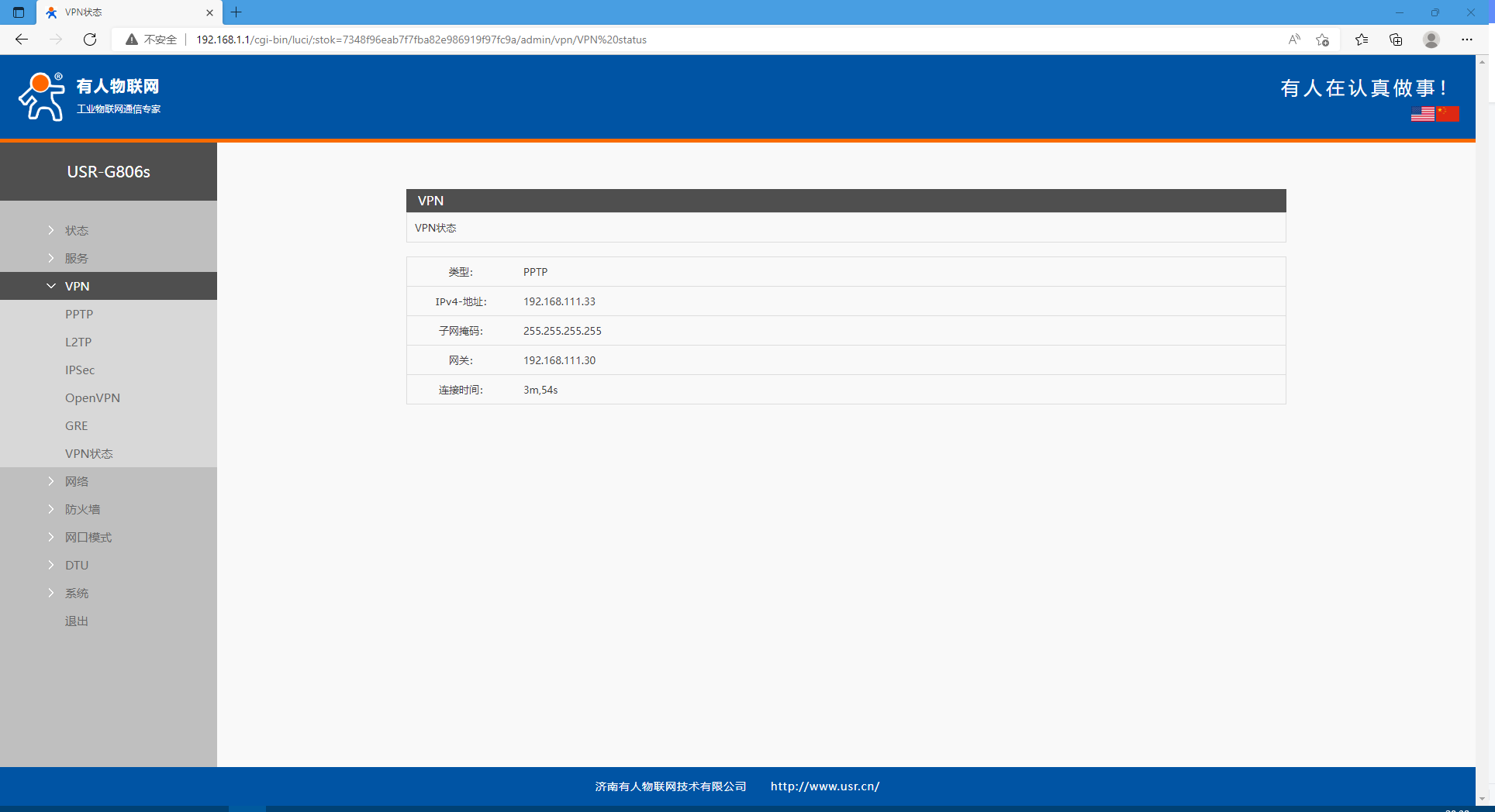 USR-G806s 通过PPTP协议连接VPN服务器案例