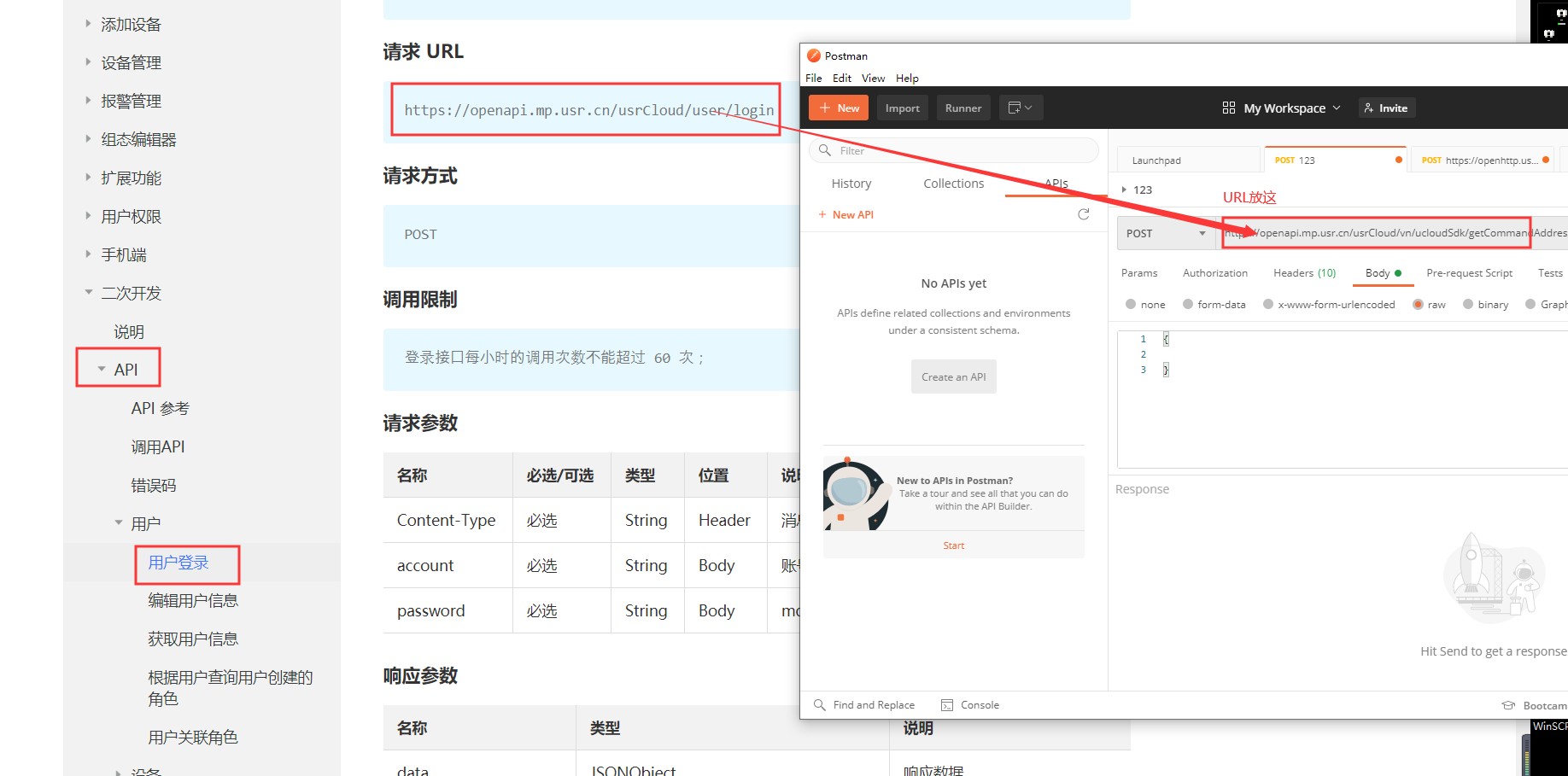 1、在接口文档中找到用户登录接口(二次开发-API-用户-用户登录)