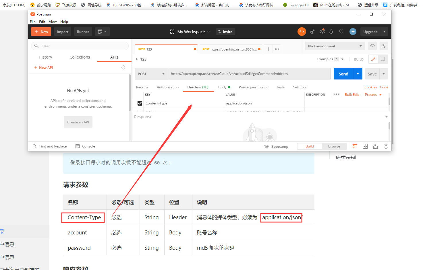 8、在headers中添加Content-Type和token,值分别为application/json以及刚刚获取到的token